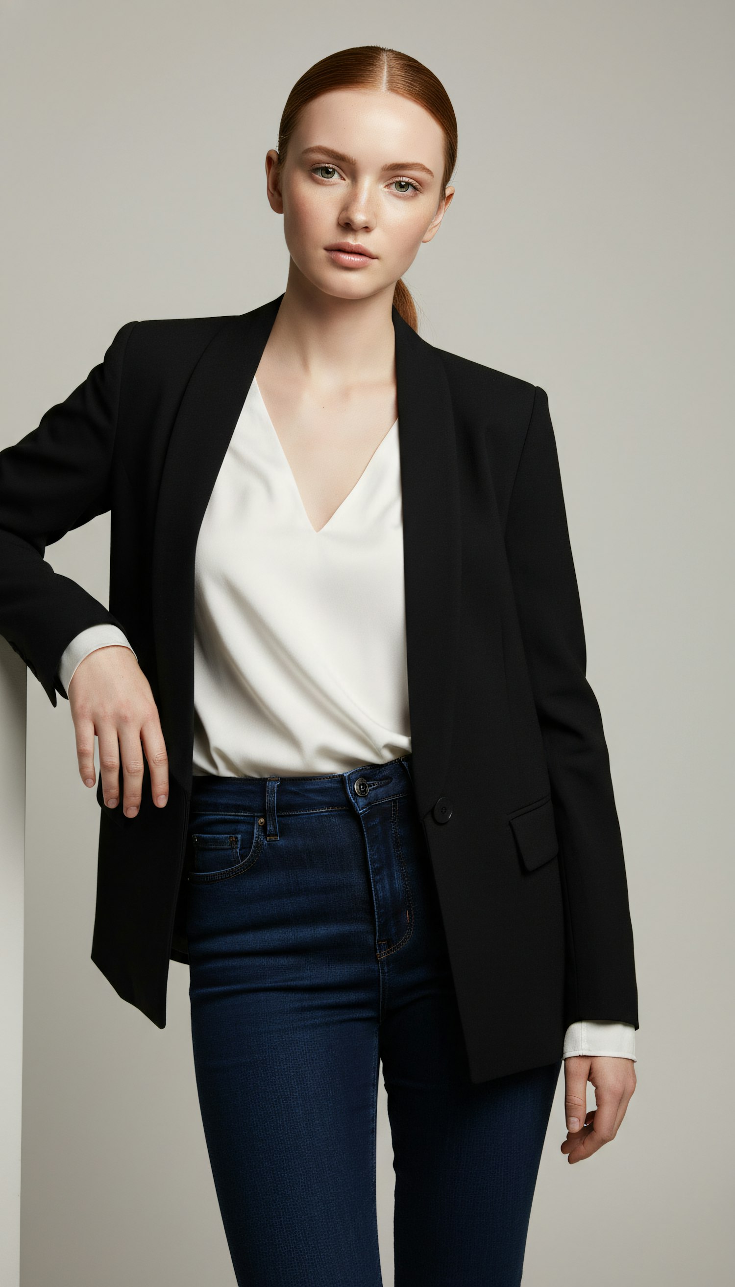 A person in a black blazer, white blouse, and dark jeans poses against a plain background, showcasing a clean and professional look.