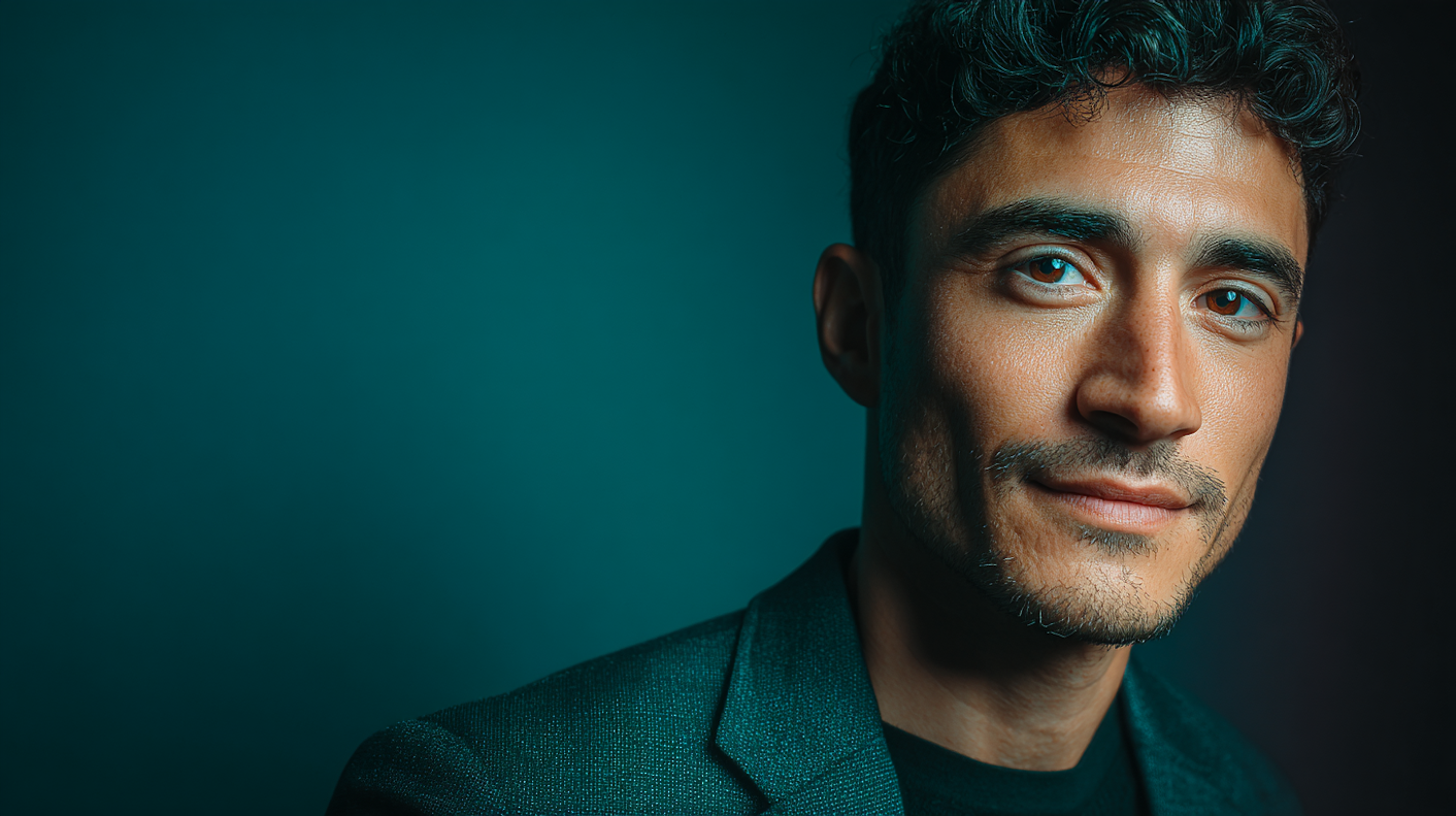 Close-up portrait of a man with curly dark hair, blue eyes, and a trimmed beard, wearing a dark blazer against a teal background.