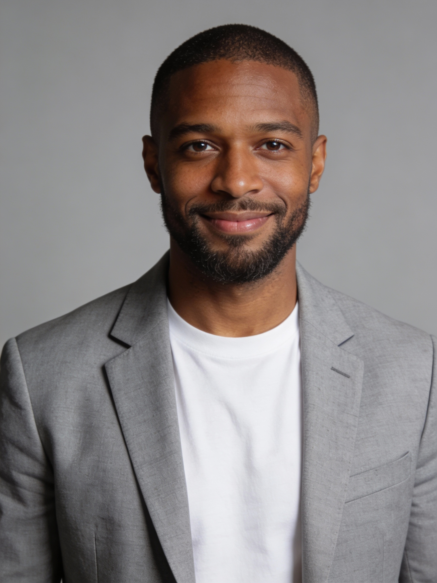 Studio portrait of a male startup professional, age 35; deep skin tone with neutral-warm undertone; short hair neatly tapered; groomed beard. Outfit: light gray sport blazer (unstructured, clean lapels, no logos) over a crisp white crewneck t-shirt (no logos). Neutral mid-gray seamless backdrop; Rembrandt lighting with soft fill; 105 mm macro-sharp; corporate leadership headshot style, clean catchlights, premium finish. Expression: steady and friendly, subtle closed-mouth smile, direct eye contact. Framing: portrait orientation, 3:4 ratio; mid-chest-up; centered; eye level; front view; full head inside frame; shoulders visible. Neutral studio composition, no props, no logos, no sunglasses, no bags.