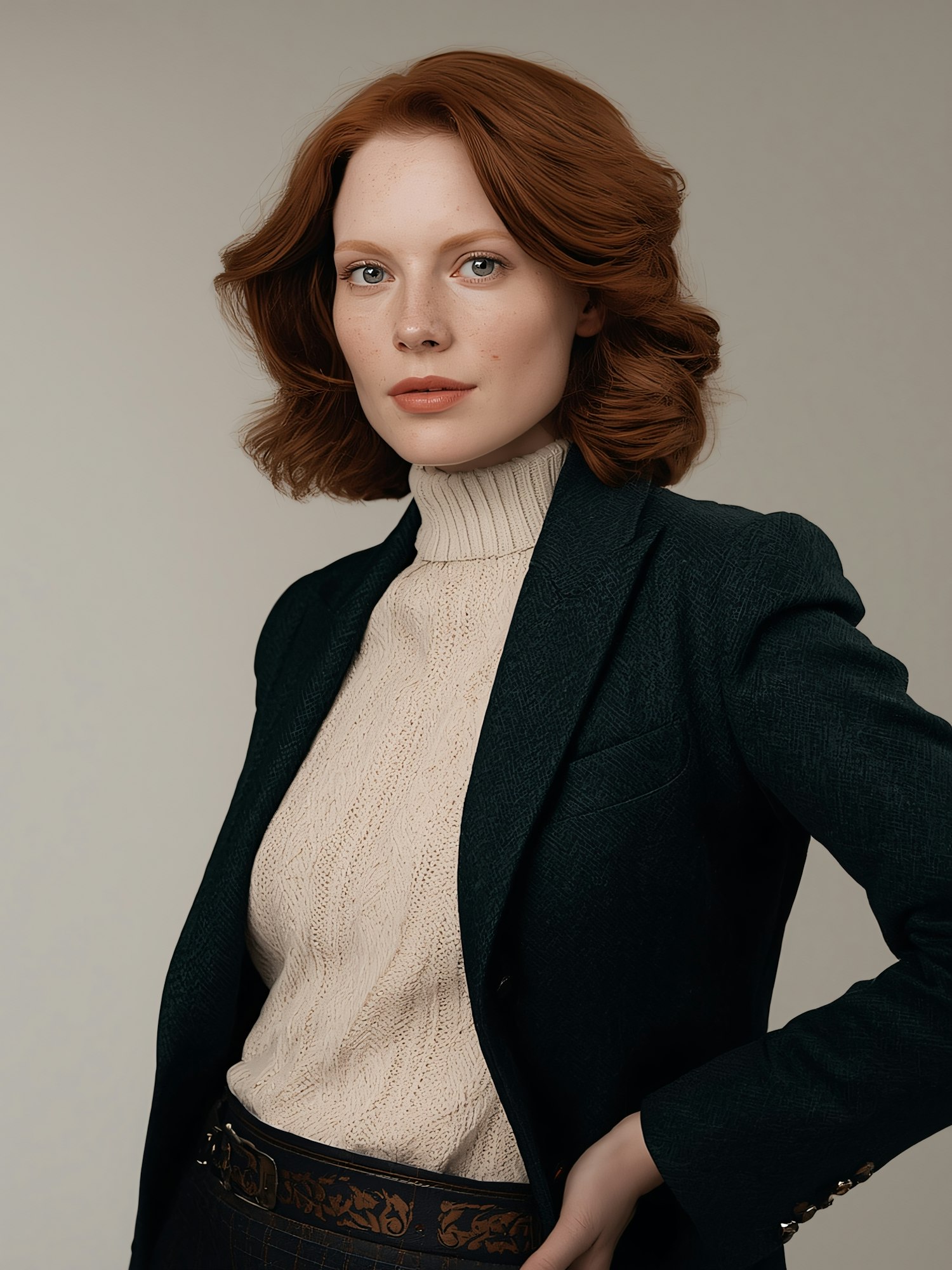 A professional portrait of a red-haired woman in a green blazer and cream sweater, exuding elegance and confidence.