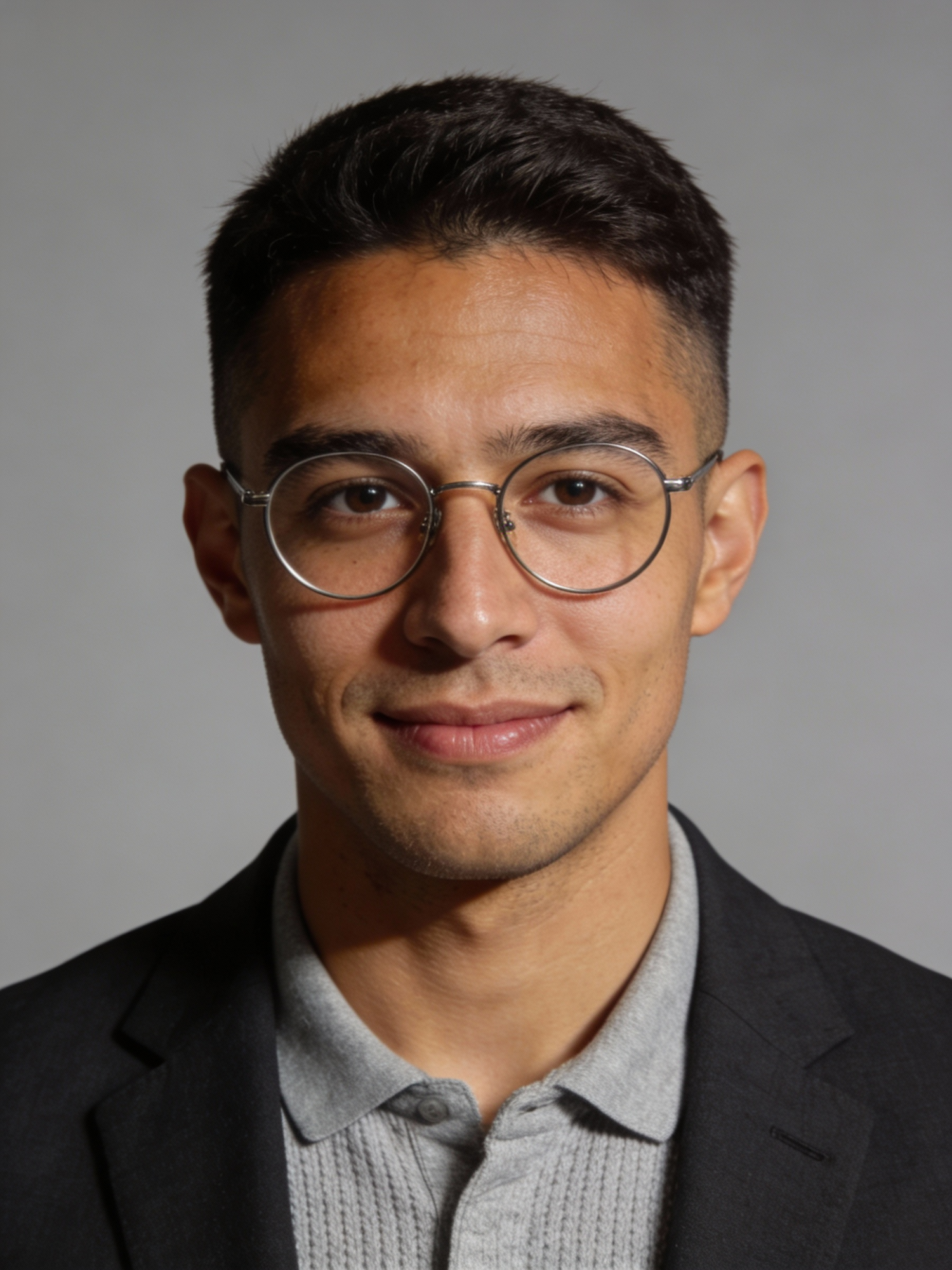 Studio portrait of a handsome male professional, age 30; light-to-medium tan skin, neutral undertone; thick dark hair, short and neatly styled; clean-shaven; round metal eyeglasses; charcoal blazer over a light gray knit polo, no logos; neutral mid-gray seamless backdrop; Rembrandt lighting with soft fill; 105 mm macro-sharp. Expression: thoughtful and calm, subtle closed-mouth smile. Framing: 3:4, mid-chest-up, centered, eye-level, front view. Full head/hair inside, shoulders visible, no cropping. No props, natural texture, not overly retouched.