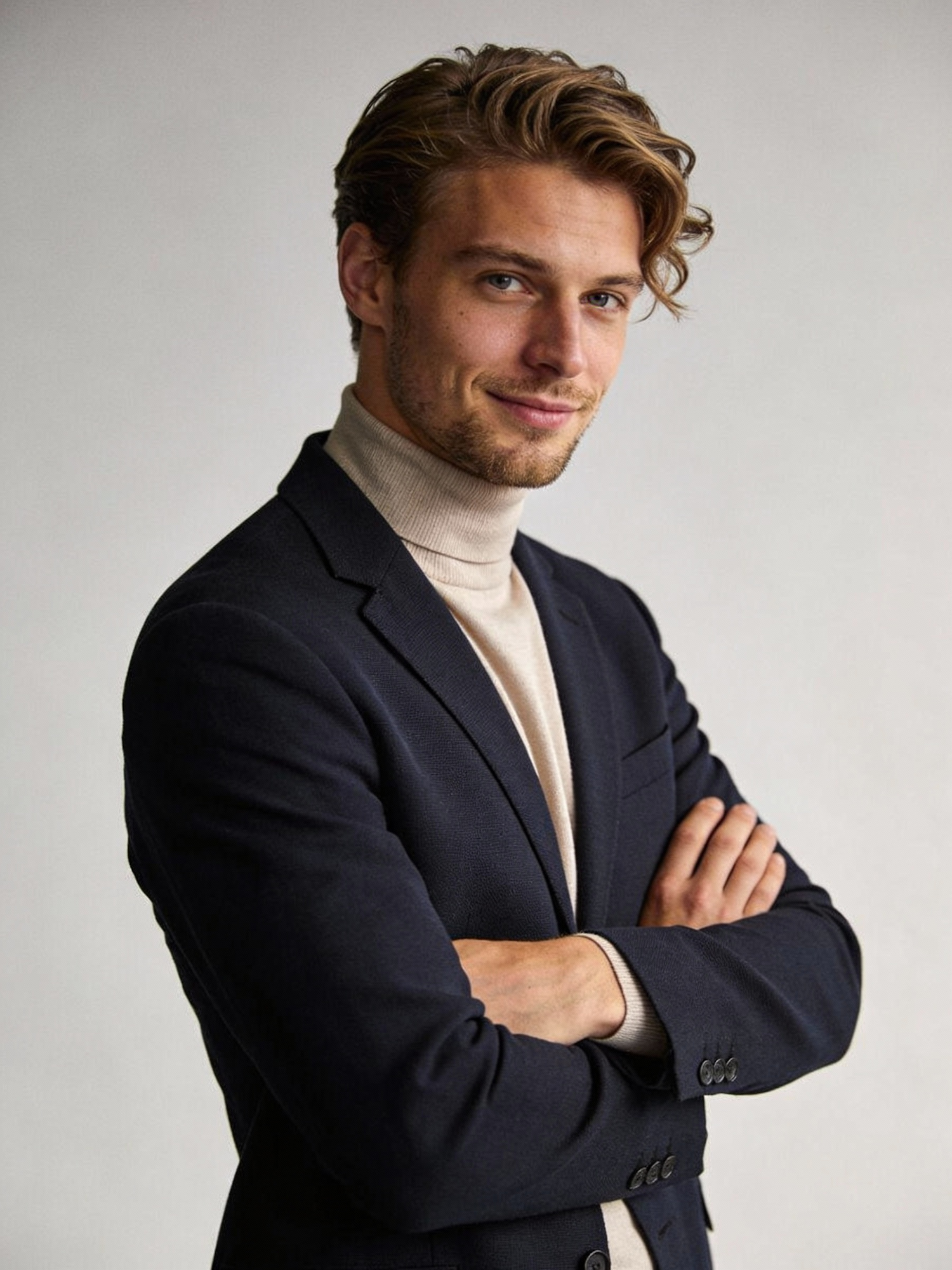 A confident man in a navy blazer and beige turtleneck poses with crossed arms against a neutral background.
