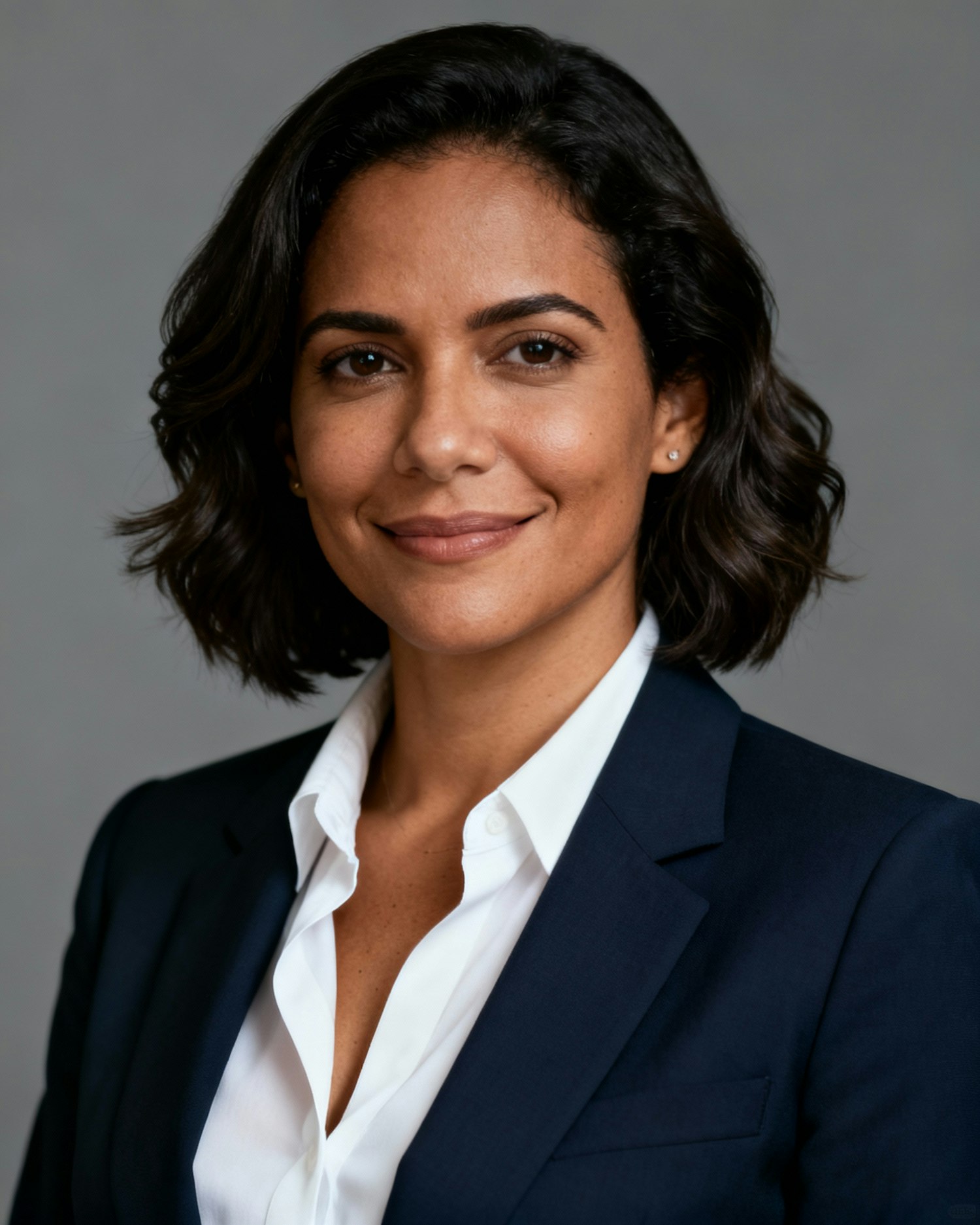 Professional portrait of a woman in a navy blazer and white shirt, smiling warmly against a neutral gray background.