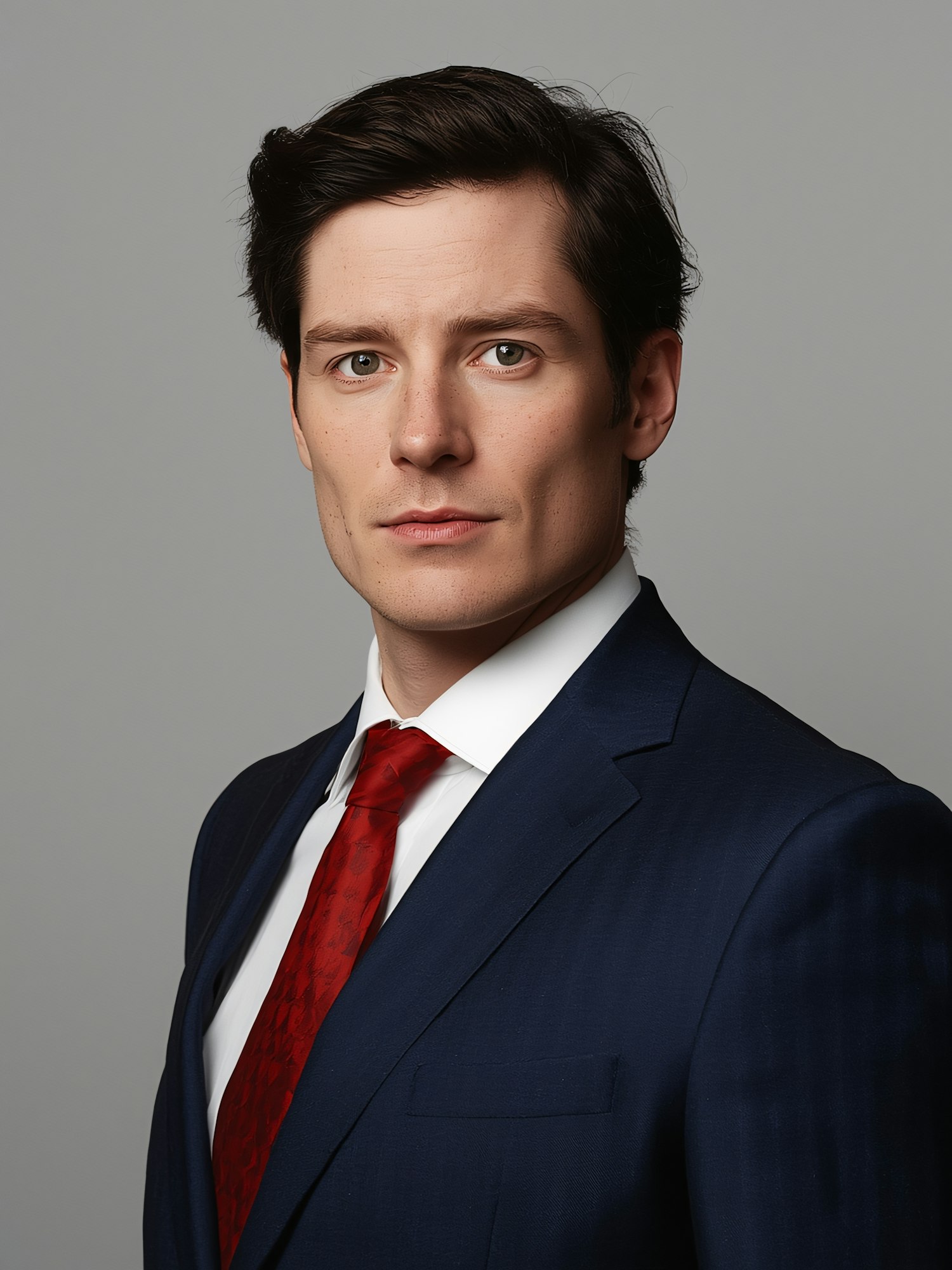 Professional portrait of a man in a navy suit and red tie, set against a neutral gray background.