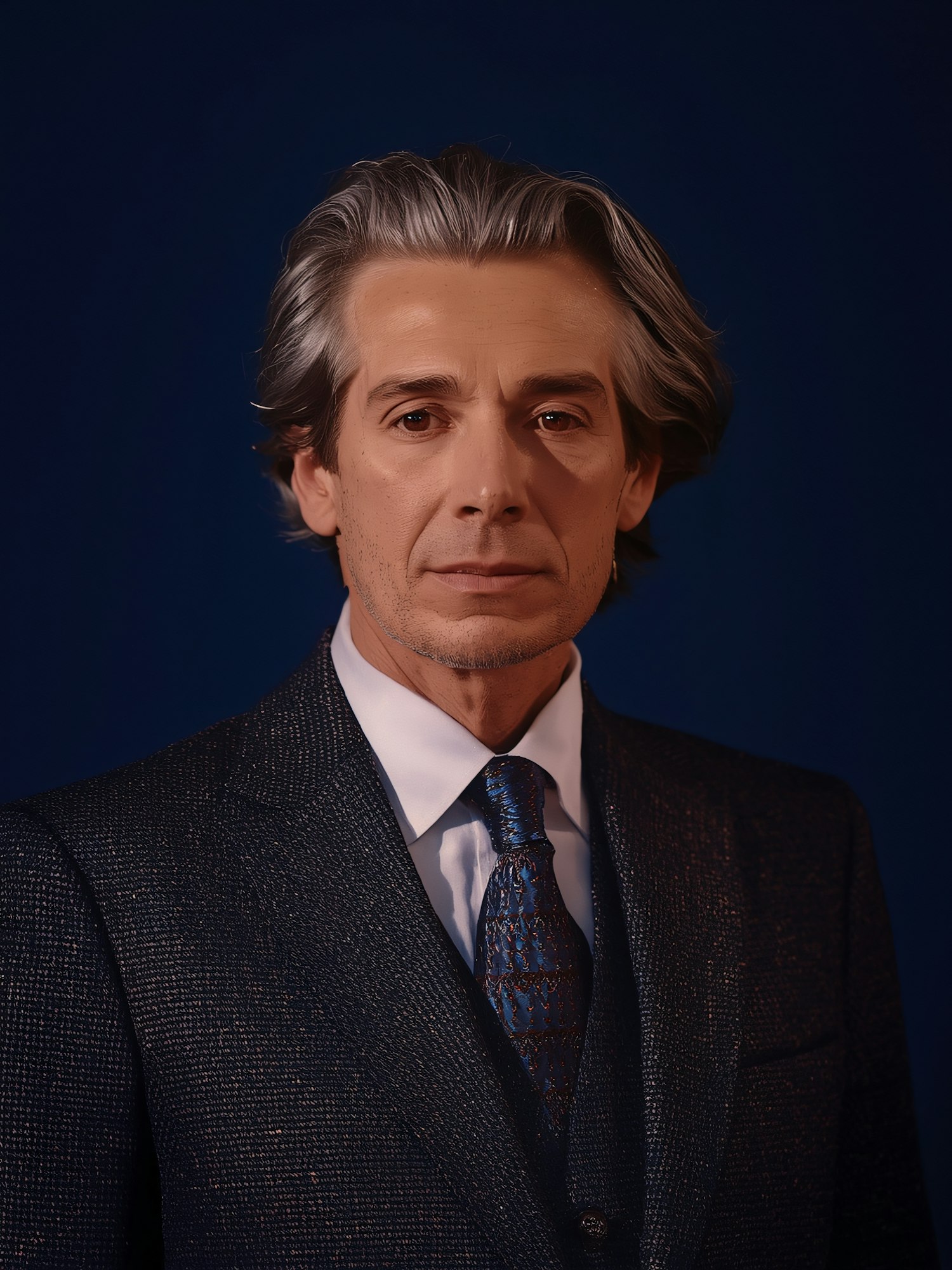A middle-aged man in a textured suit and patterned tie, set against a dark blue background, exuding a formal and professional vibe.