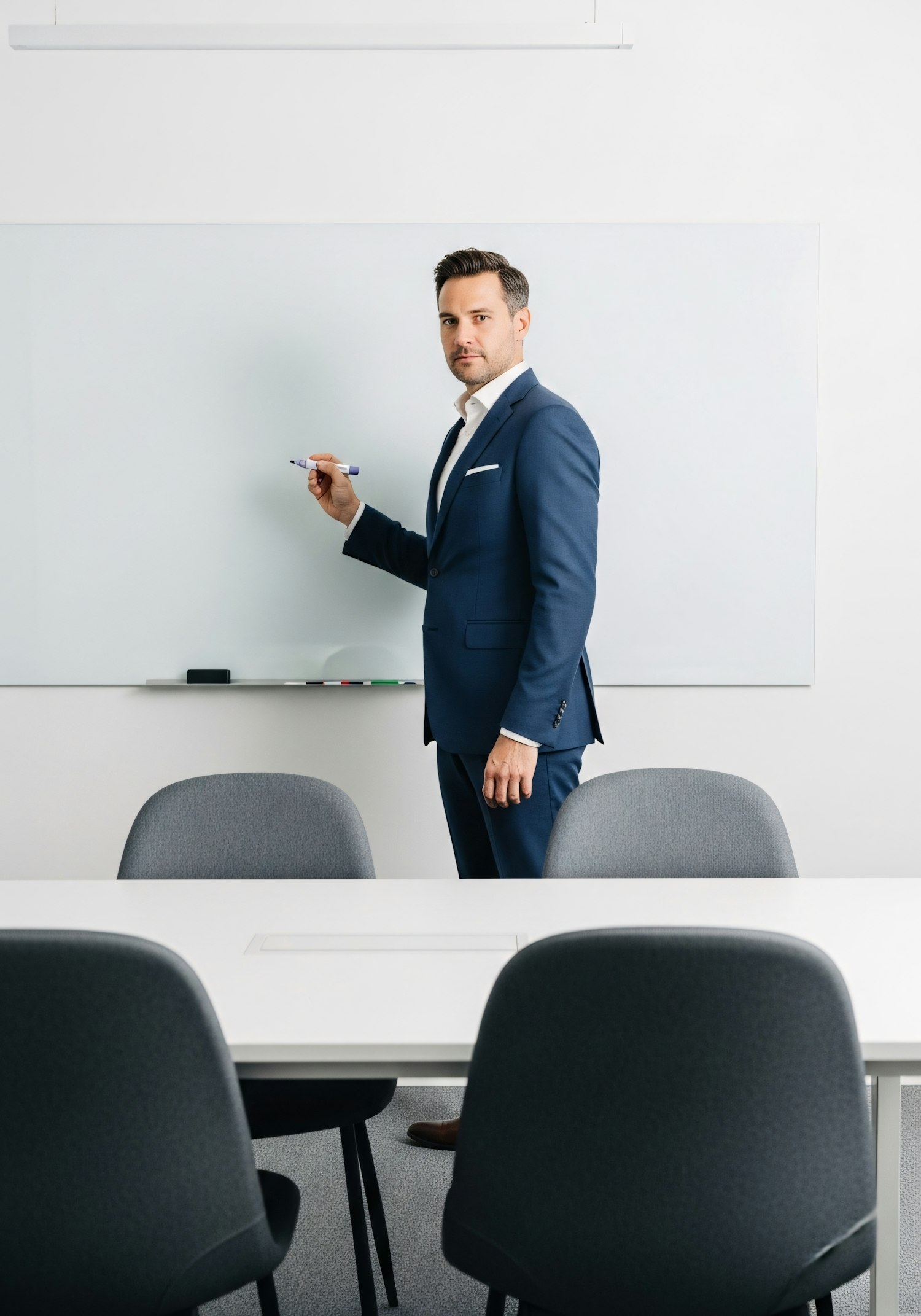 A professional man in a blue suit stands by a whiteboard in a modern conference room, holding a marker, ready for a presentation.