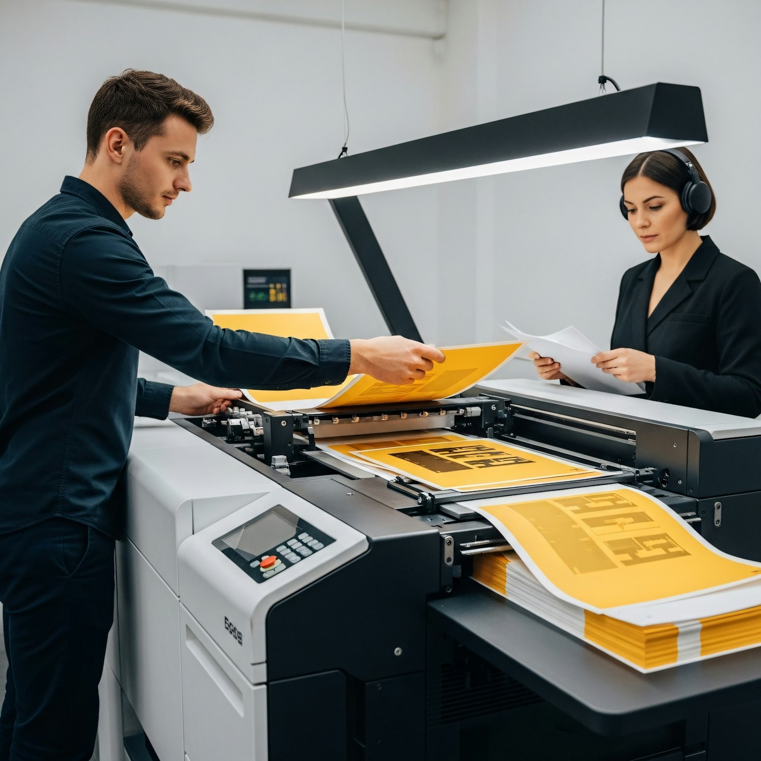 Two professionals working with a modern industrial printer, handling vibrant yellow prints in a sleek, well-lit workspace.