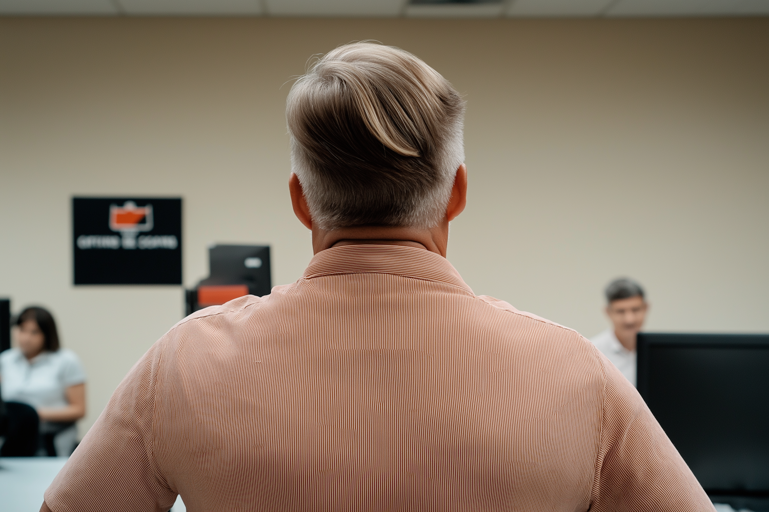 Man with gray hair in striped shirt stands in office, facing colleagues at desks with computers. Neutral tones and a wall sign in background.