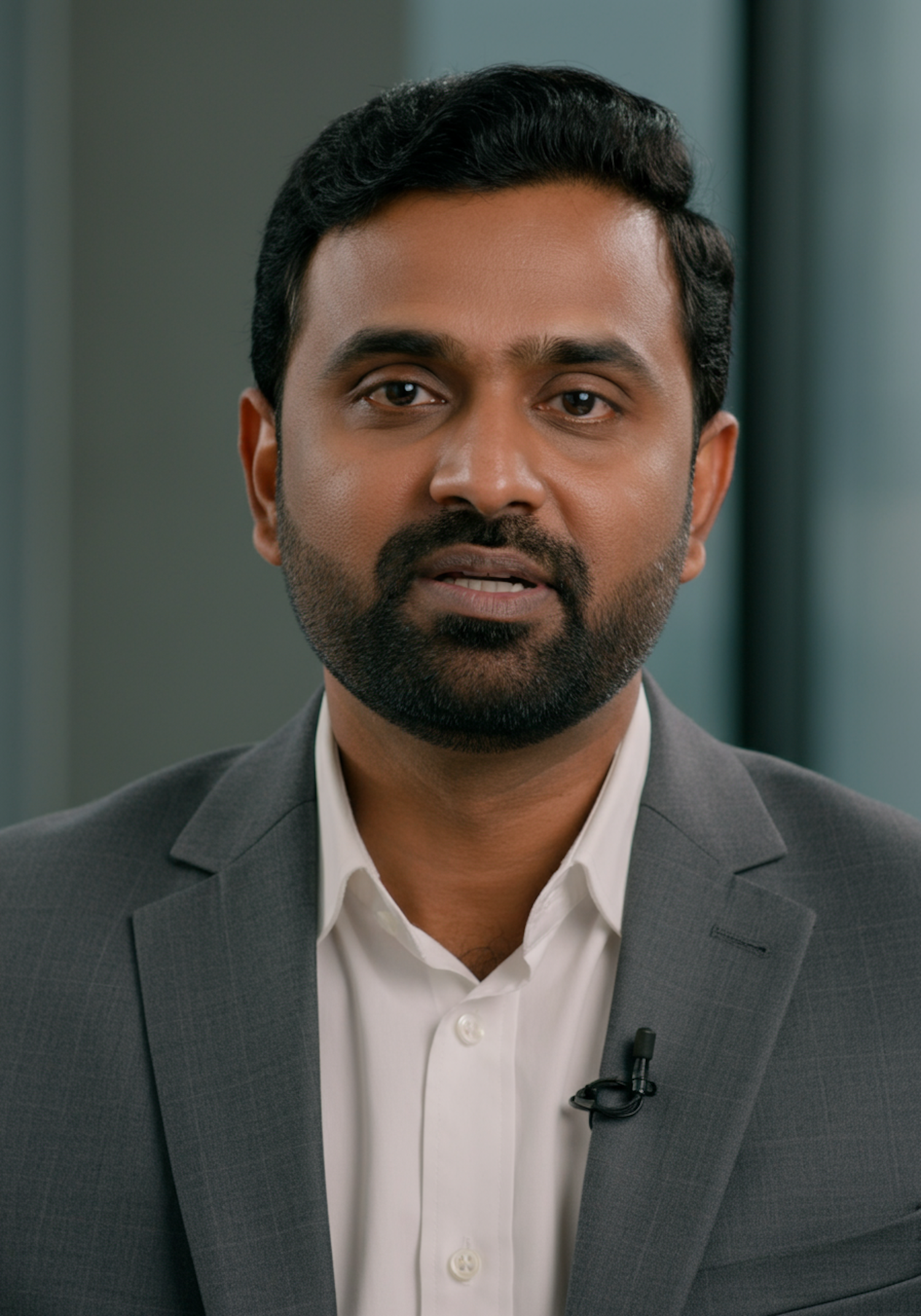 A man in a gray suit and white shirt with a microphone clipped to his lapel, set against a softly blurred indoor background.