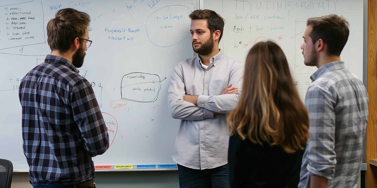 Four colleagues discuss ideas in front of a whiteboard filled with notes and diagrams, indicating a collaborative work session.