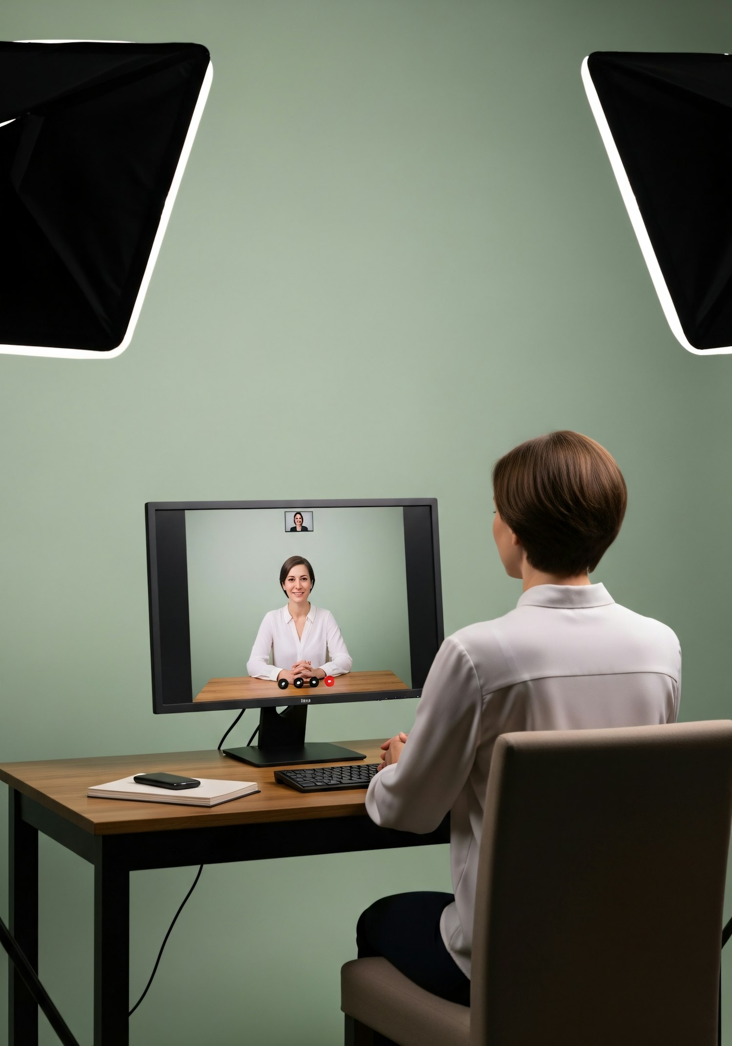 A professional video conference setup with a person at a desk, featuring a monitor displaying another individual in a virtual meeting.
