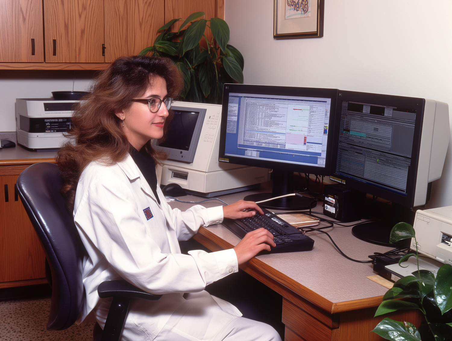 Woman in lab coat working on dual monitors in an office, surrounded by tech equipment and greenery, focused on data analysis.