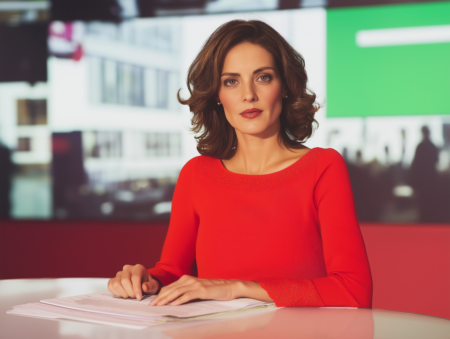A poised woman in a red dress sits at a desk with papers, set against a blurred studio background with green and white elements.