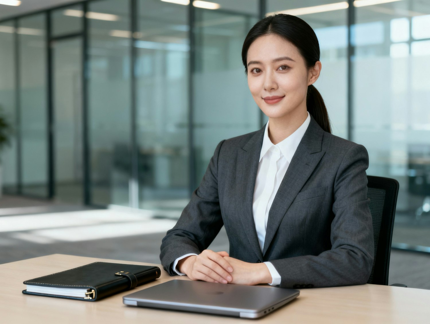 Studio portrait of a woman legal counsel, around 33; porcelain skin (cool); sleek low ponytail. Sitting straight at a desk with a slim folio and laptop, glass-partition office background; soft daylight, clamshell + gentle rim; 105 mm macro-sharp. Wardrobe: charcoal suit jacket over white blouse (non-branded). Expression: composed, confident. Skin: clean studio glow, lightly smoothed. Negative as above.