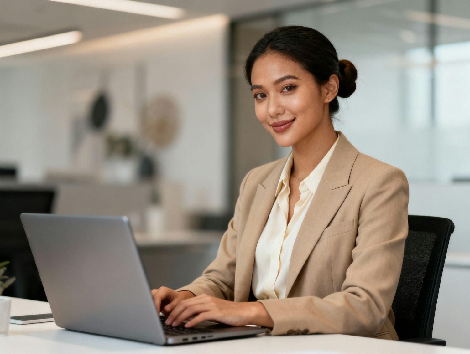 Professional woman in a beige blazer working on a laptop in a modern office setting, exuding confidence and focus.