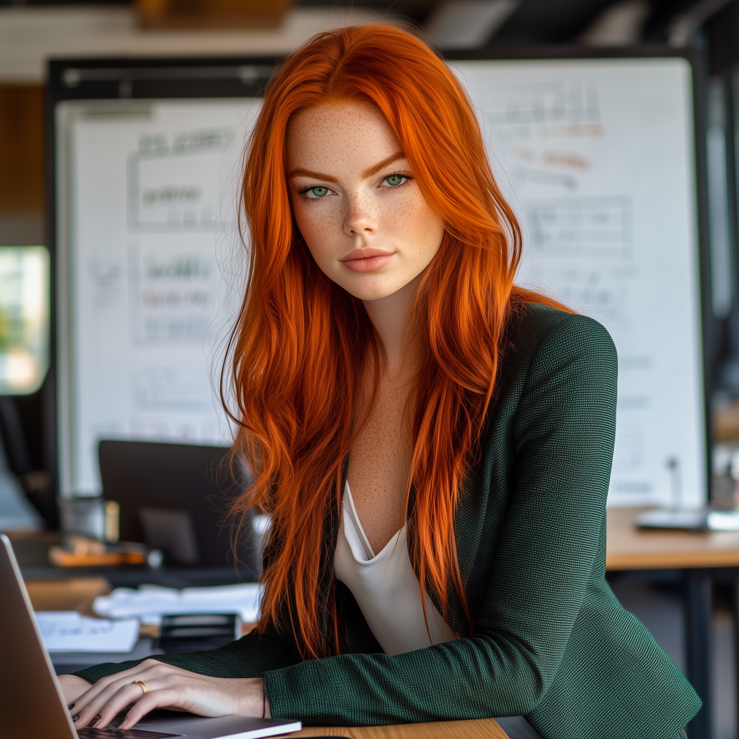 Young woman with red hair and green eyes working at a desk in an office, wearing a green blazer and white blouse.