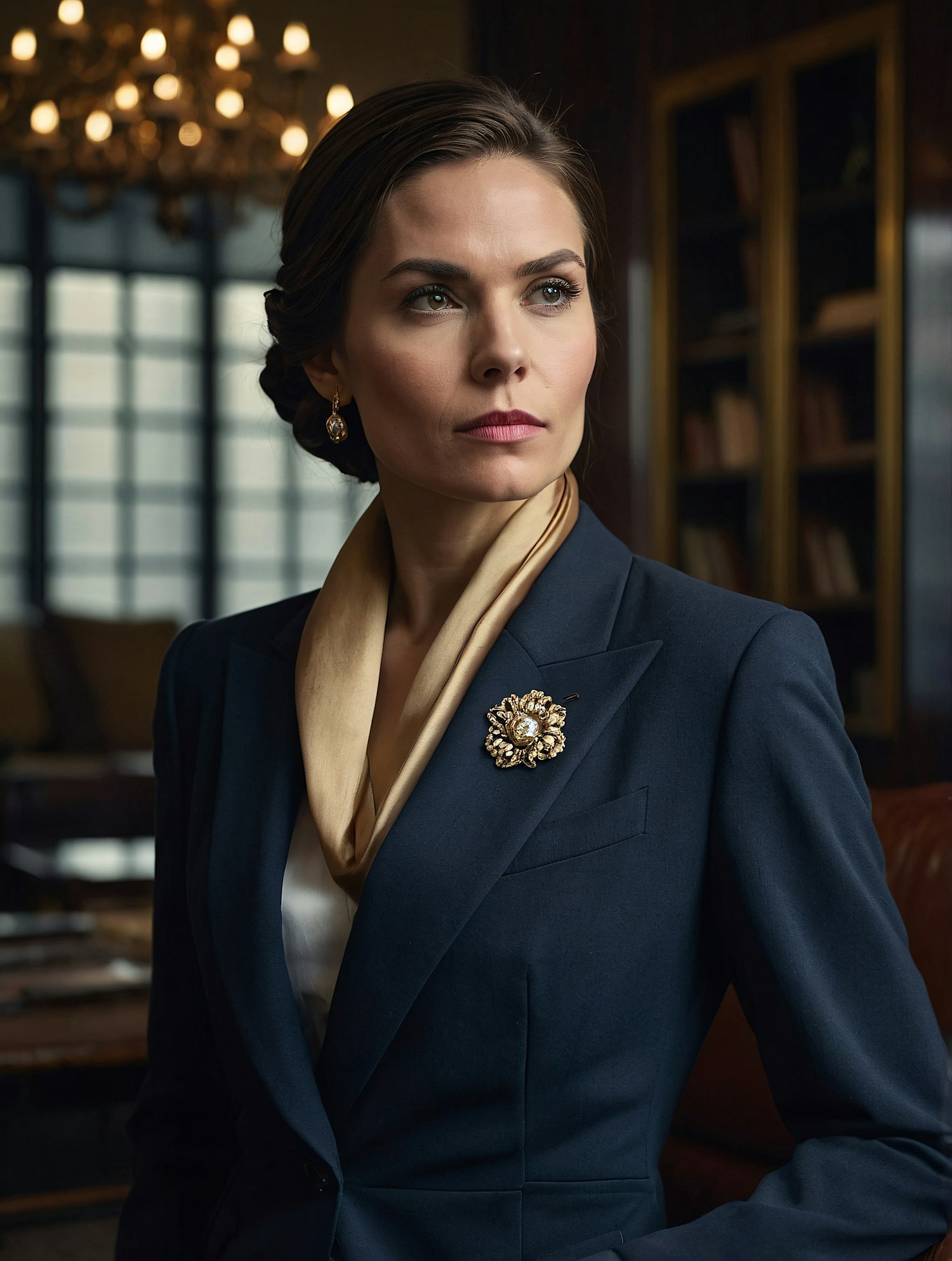 Elegant woman in navy blazer with brooch, standing in a sophisticated library setting, exuding confidence and poise.