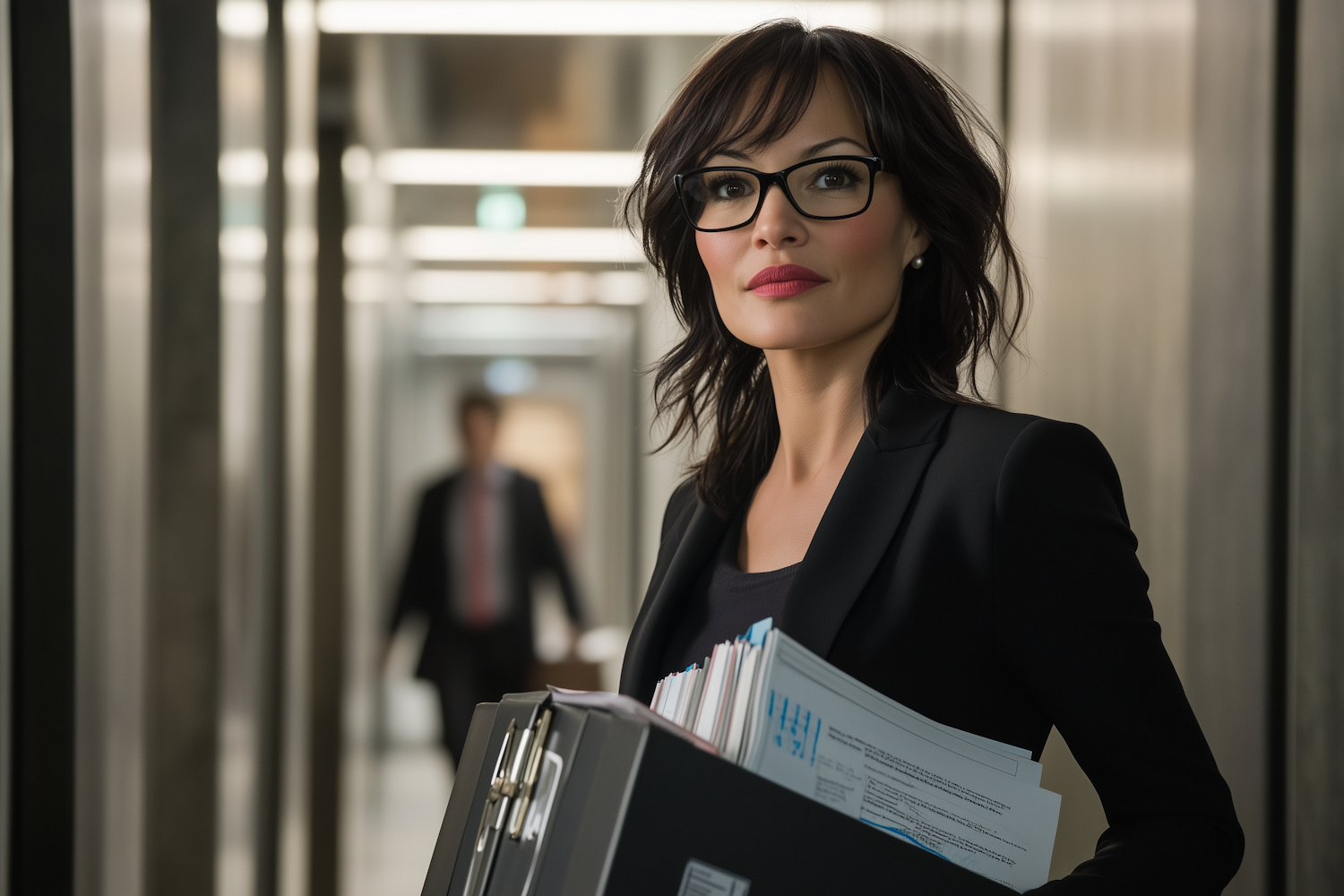 Confident woman in glasses holding documents in a modern office hallway, exuding professionalism and focus.