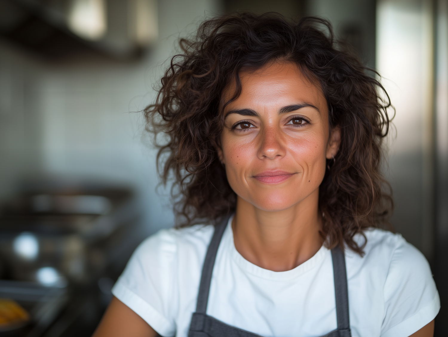 Confident woman with curly hair in a kitchen, wearing a white shirt and gray apron, exuding professionalism and warmth.
