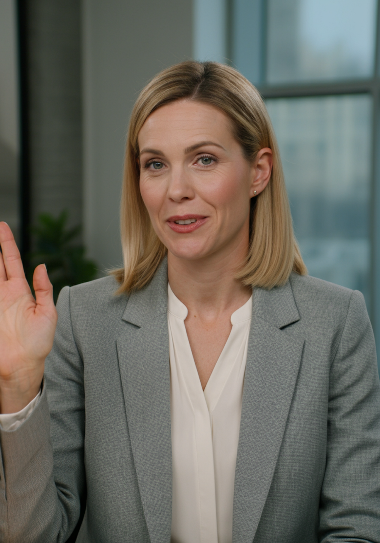 Professional woman in a gray blazer and white blouse gesturing in an office setting with a blurred background.