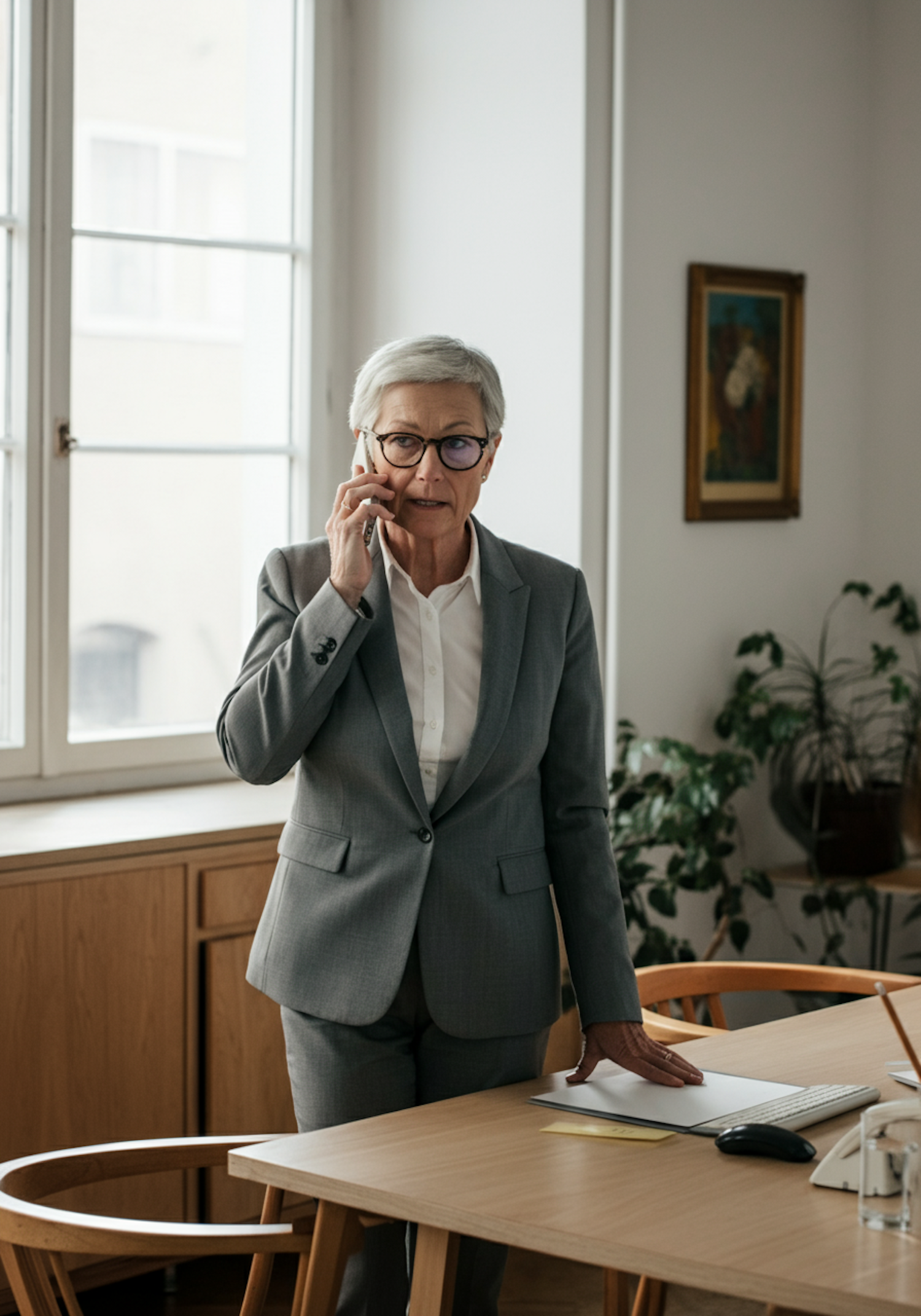 Professional woman in a gray suit speaking on the phone in a bright office with a desk, plants, and natural light.