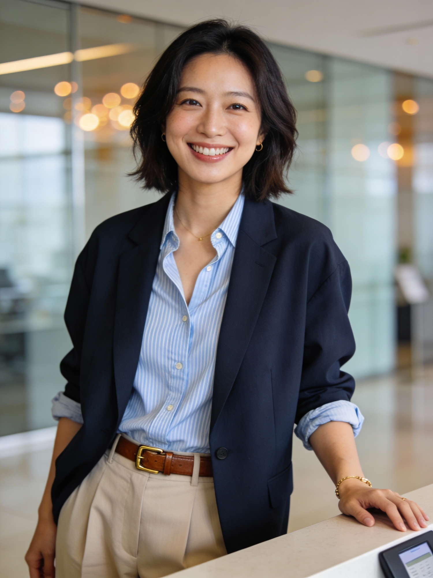 Ultra-realistic professional portrait of a confident Japanese woman, early 30s, approachable and sharp. Framing: tight chest-up close-up, centered, eye-level. Pose: one hand resting lightly on the edge of a minimal lobby counter/desk (only a clean edge visible at the bottom of frame); other arm relaxed; slight lean; natural posture. Expression: candid success-laugh—a warm, genuine smile with a hint of laughter (teeth slightly visible), uplifted cheeks, energized mood. Eye contact: directly looking at the camera with clean catchlights. Outfit (match reference): deep navy oversized sport blazer (single-breasted, relaxed fit) over a light blue striped button-up shirt (top button open, sleeves casually rolled), high-waisted beige tailored wide-leg trousers implied, medium-brown leather belt with a simple buckle, minimal gold jewelry. Hair: neat shoulder-length bob with soft volume, natural makeup. Background: bright contemporary office lobby with glass partitions and soft warm bokeh highlights, strongly blurred. Locked shoot settings: soft daylight + gentle fill, subtle rim light, premium corporate/editorial retouch, natural skin texture, 85mm look, shallow depth of field, clean neutral slightly warm color grade, high-end corporate photography. Props: minimal desk/counter edge only; no signage, no devices, no readable labels. No readable text, no logos, no watermark.
