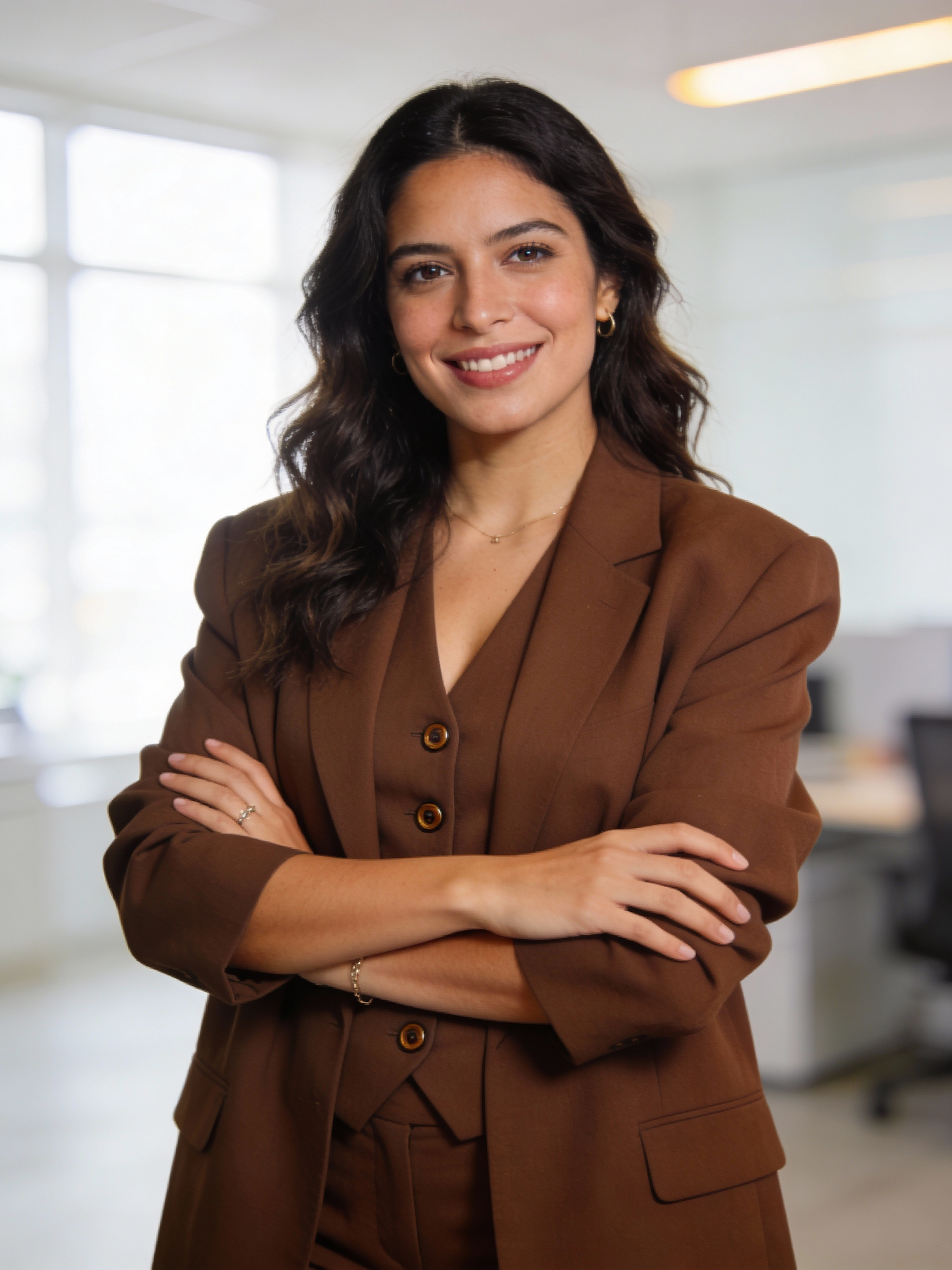 Ultra-realistic professional portrait of a confident Mexican woman, early 30s. Outfit: chocolate-brown oversized blazer over matching buttoned vest (visible buttons), matching trousers implied; minimal jewelry. Hair: wavy loose worn down. Framing: tight head-and-shoulders, centered, eye-level. Pose: arms crossed but with shoulders visibly dropped and relaxed, slight torso angle, no tension in hands. Expression: warm confident smile—soft eyes, relaxed jaw, authentic. Eye contact: direct to camera with clean catchlights. Background: bright contemporary office with soft bokeh, strongly blurred. Lighting: soft window daylight + gentle fill + subtle rim, premium corporate/editorial retouch. 85mm look, shallow DOF, clean neutral warm grade. No props, no readable text, no logos, no watermark.