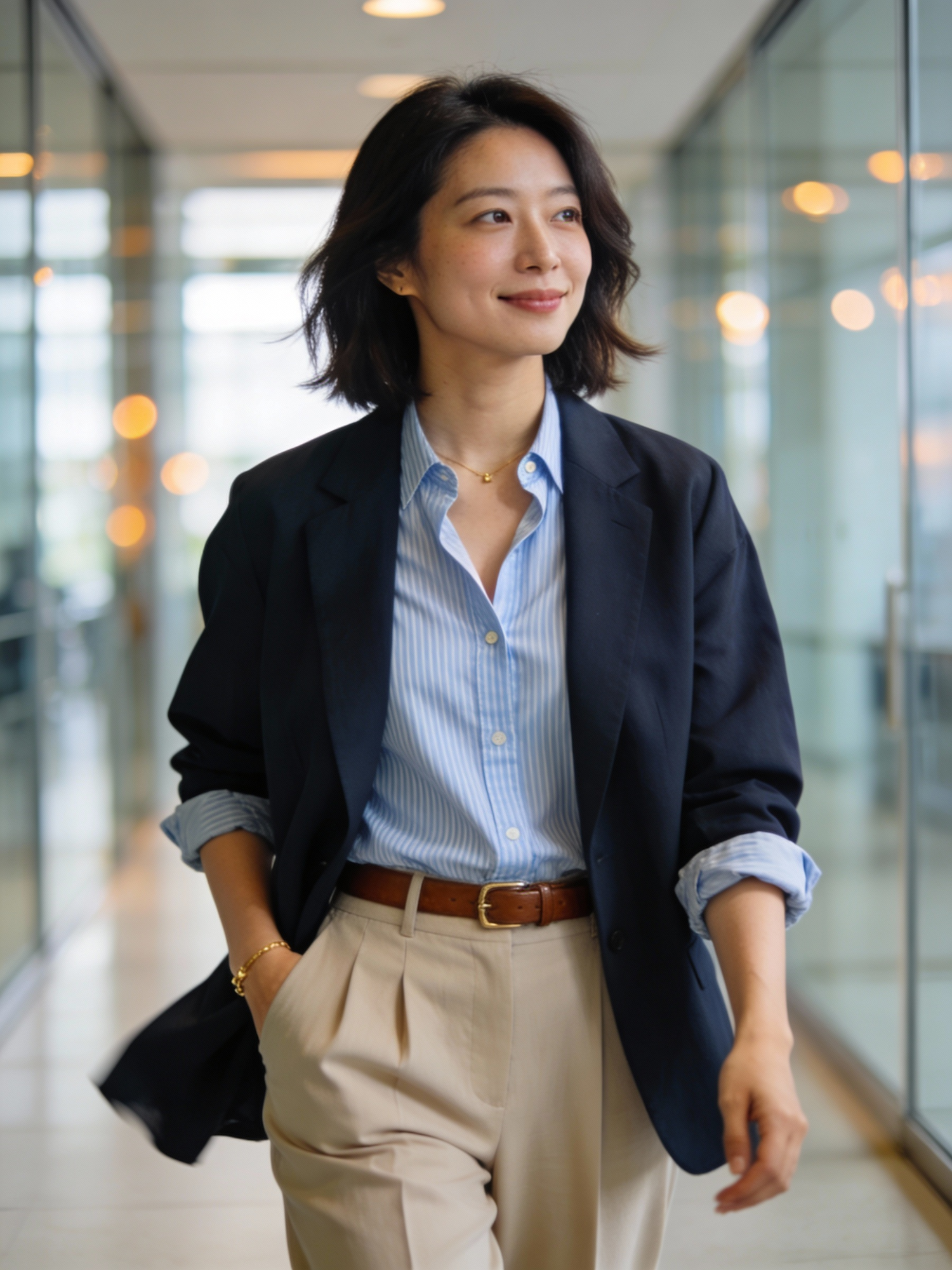 Confident professional woman in a navy blazer and beige trousers walking through a modern office hallway with glass walls.