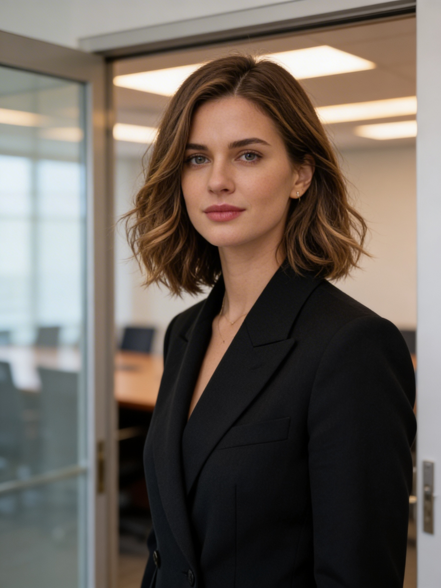 A professional woman in a black blazer stands in a modern office, exuding confidence and focus in a well-lit conference room setting.