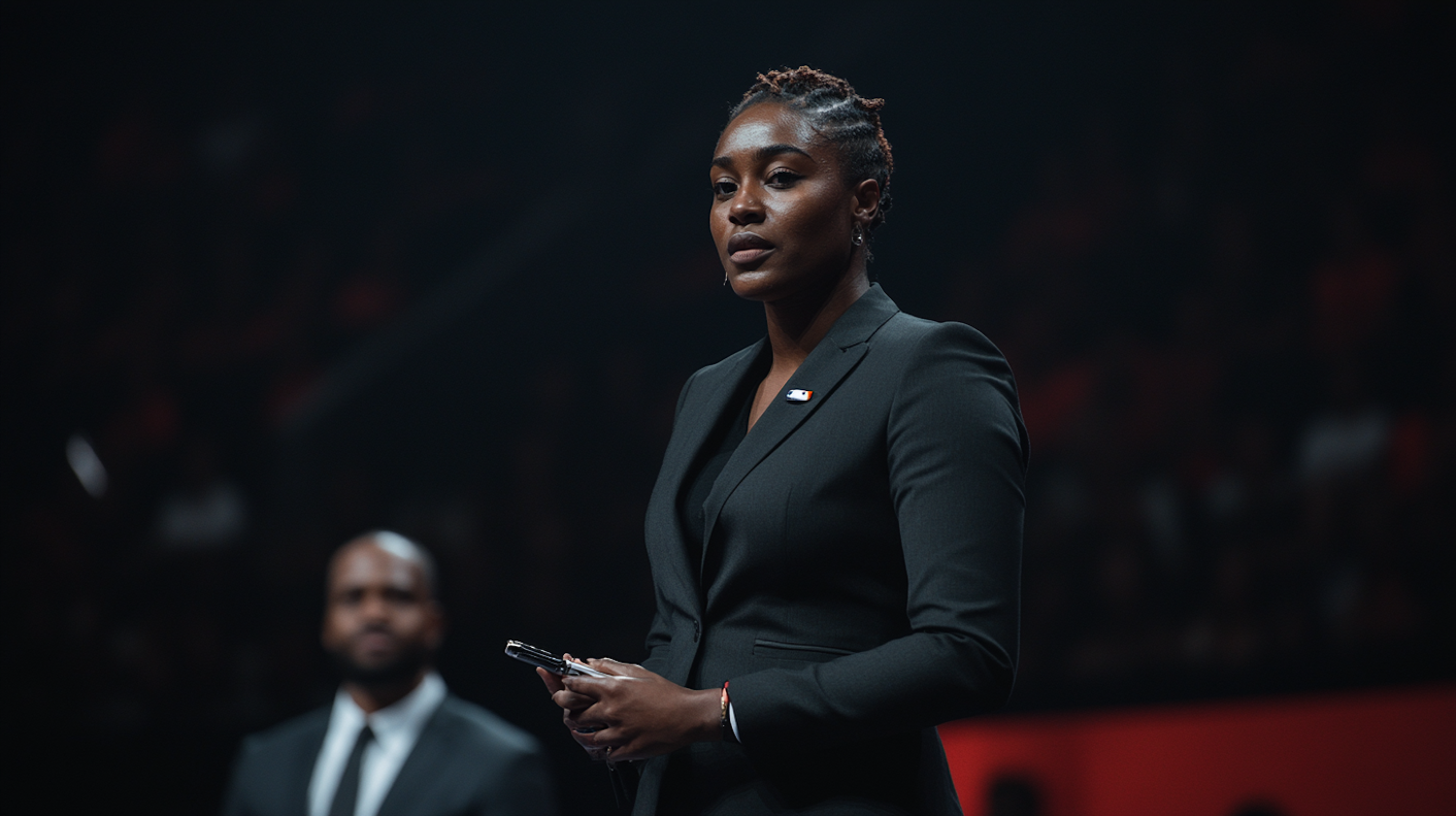 Confident Black woman in a suit holding a pen, with a serious expression, in a dimly lit setting.