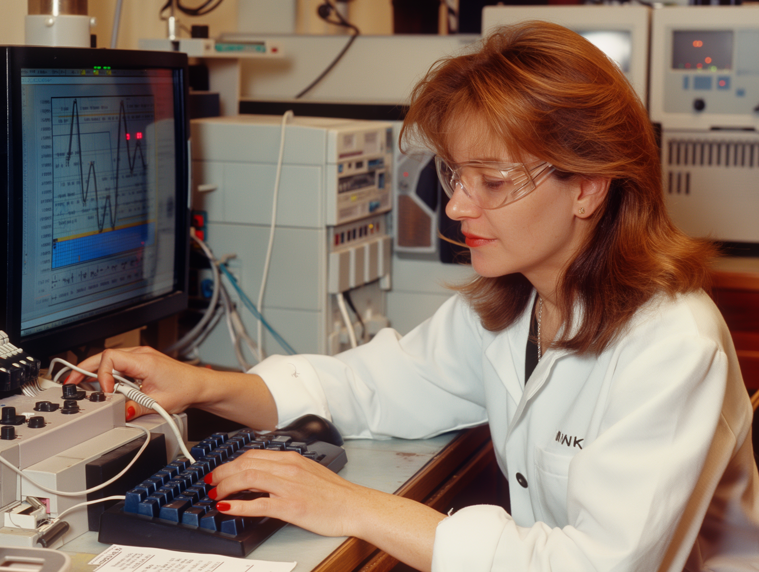 Scientist in a lab coat analyzing data on a computer screen, surrounded by lab equipment, focused and wearing protective goggles.