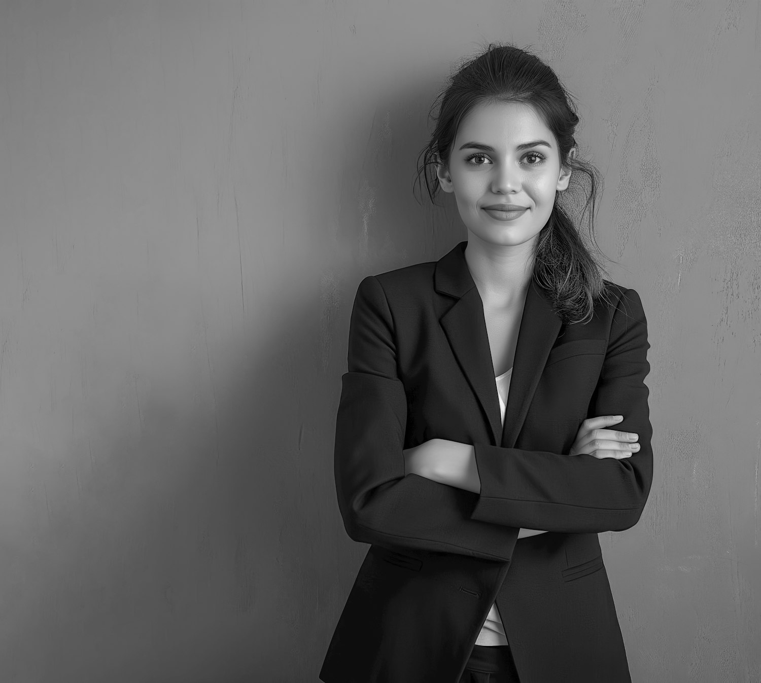 Black and white portrait of a confident young woman in a blazer, arms crossed, with a slight smile against a plain background.