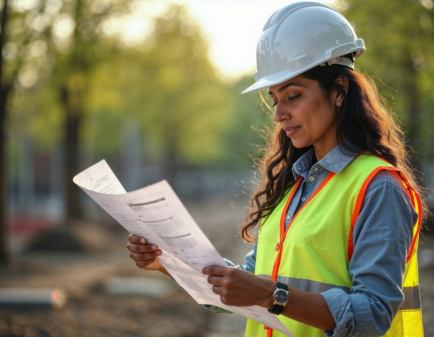 Woman in hard hat and safety vest reading blueprints at a construction site, surrounded by greenery.