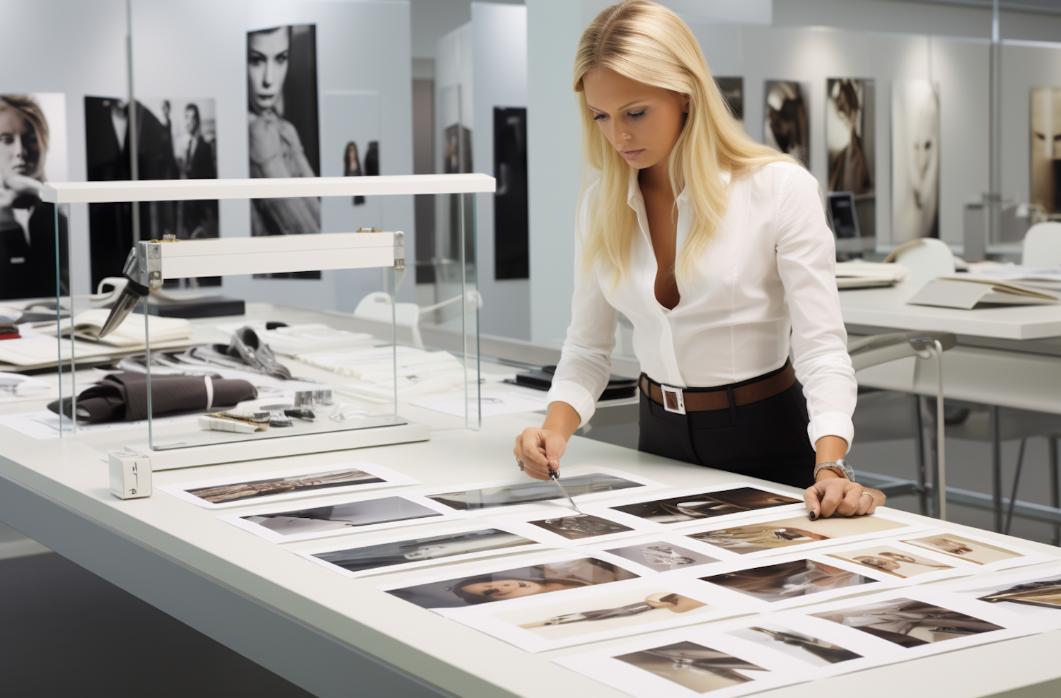 Blonde woman in a white blouse reviews fashion photos in a modern office with black-and-white portraits on the walls.