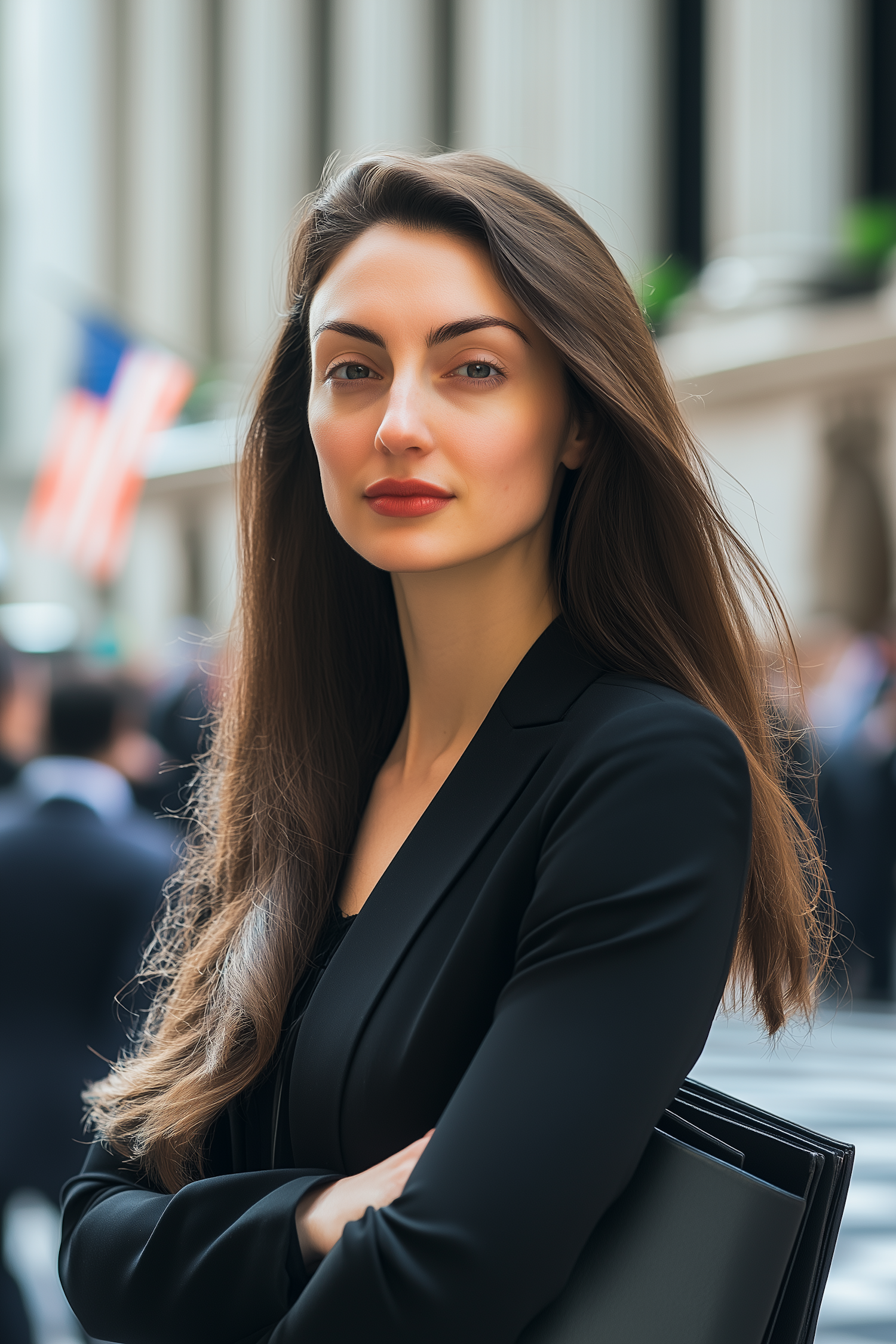 Confident woman in a black blazer with long brown hair, standing in an urban setting with an American flag in the background.