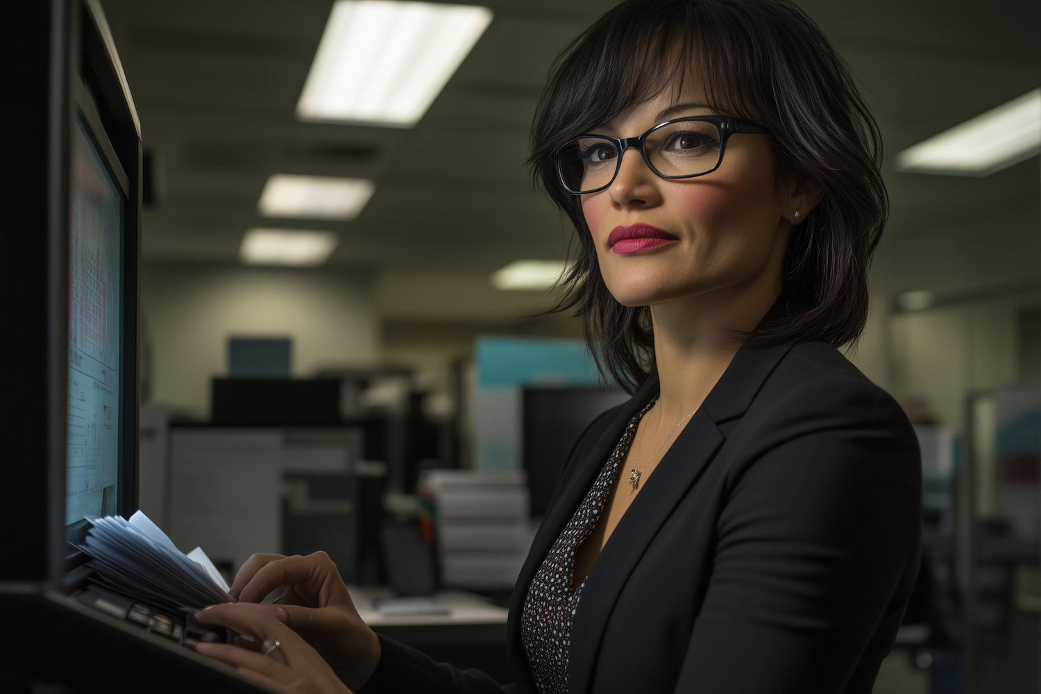 Confident woman with glasses working at a computer in an office, wearing a black blazer and patterned blouse.