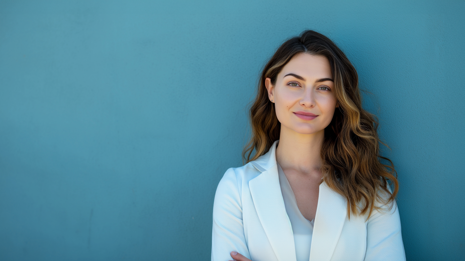 Confident woman with wavy brown hair in a white blazer against a blue background, exuding professionalism and poise.