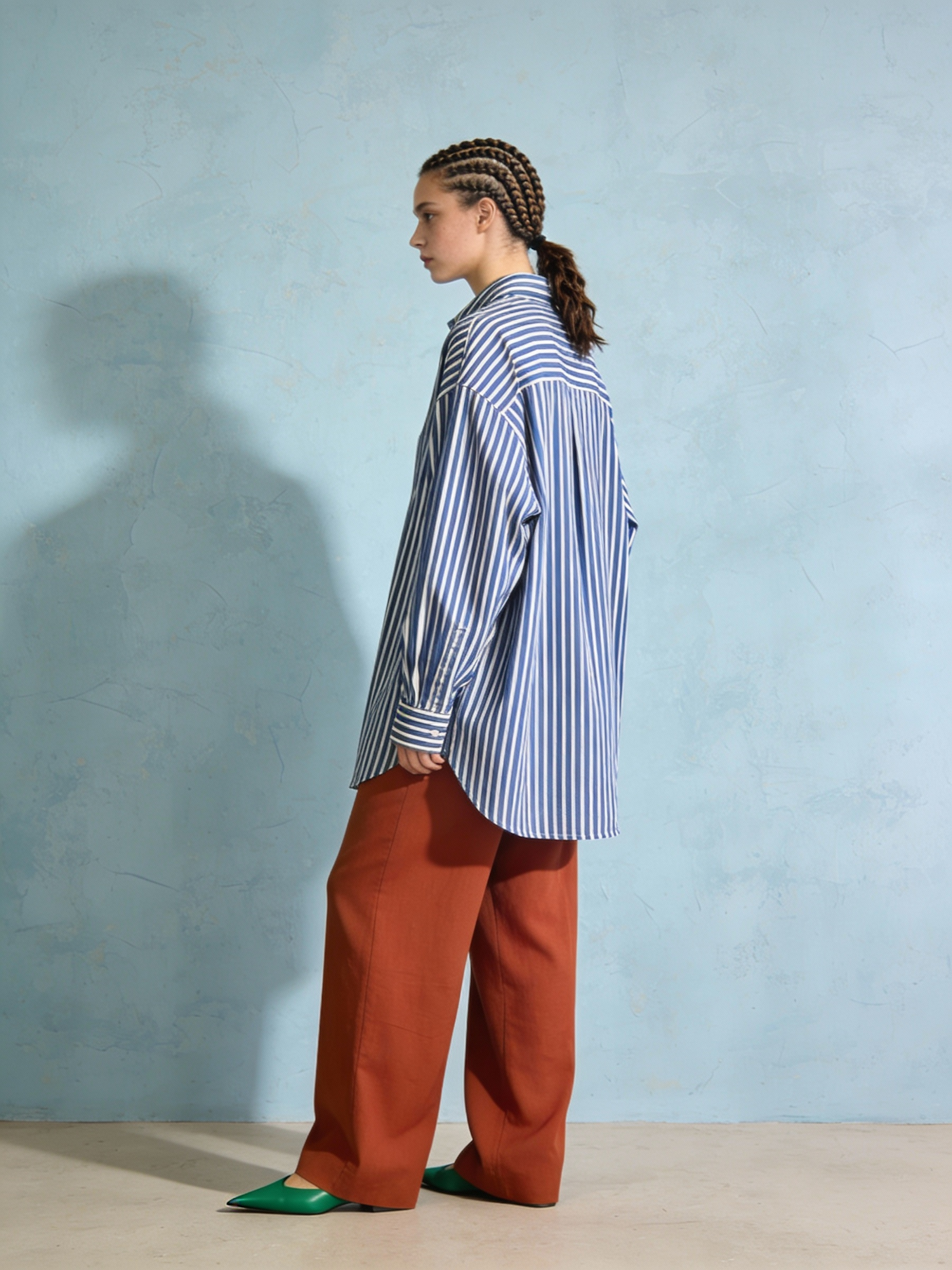 A fashion-forward individual stands in profile against a light blue textured wall, dressed in a bold, color-blocked outfit. They wear an oversized blue and white vertically striped shirt paired with rust-colored wide-leg pants and green pointed-toe flats. Their hair is styled in cornrows pulled back into a low ponytail. The composition is minimalist and editorial, with soft natural lighting casting gentle shadows to highlight the textures of the wall and the clean lines of the garments. The scene evokes Scandinavian minimalism through muted tones, confident styling, and a serene, uncluttered backdrop.