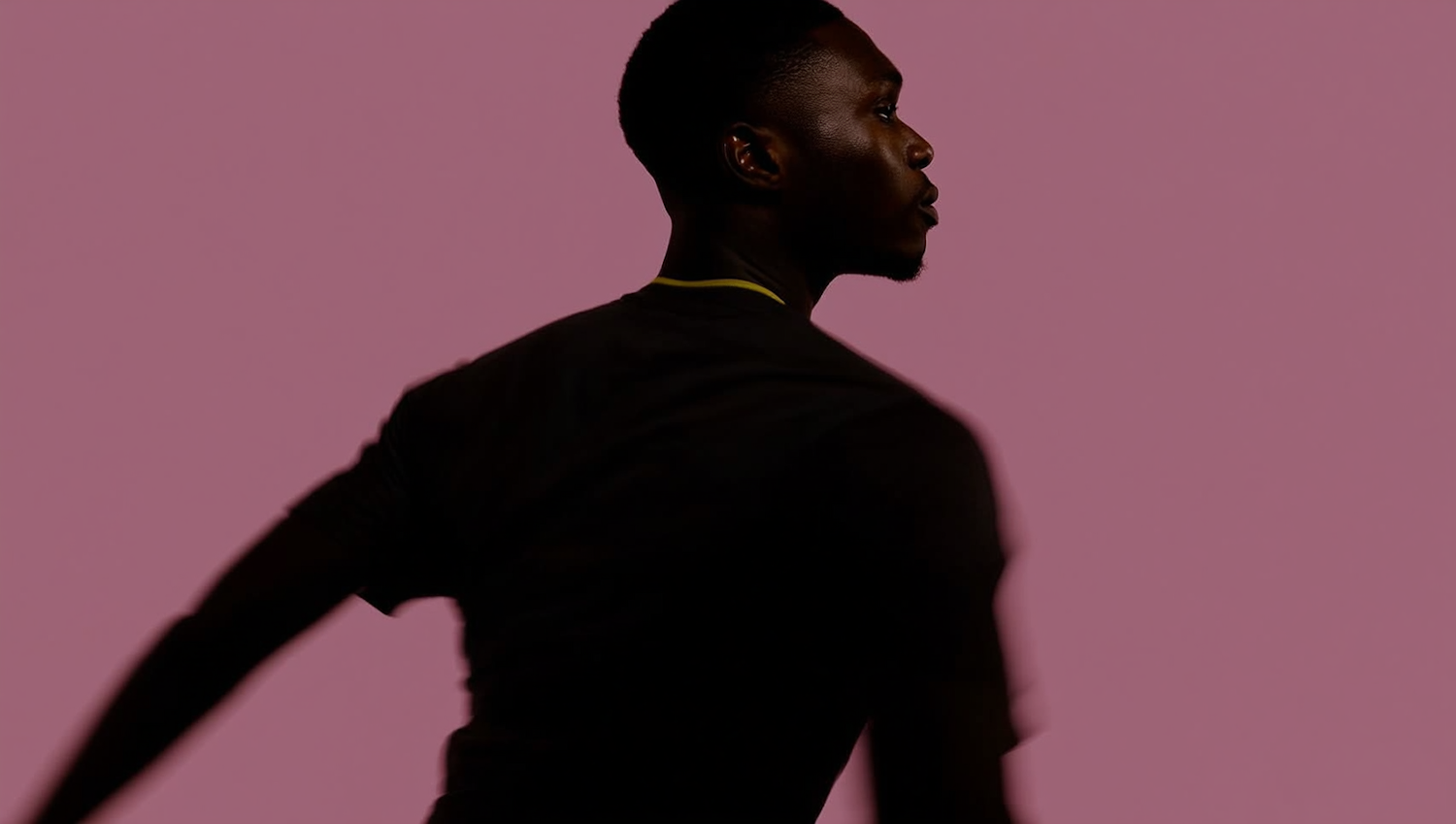 A person in motion, wearing a dark shirt with a yellow collar, set against a pink background, creating a striking contrast.