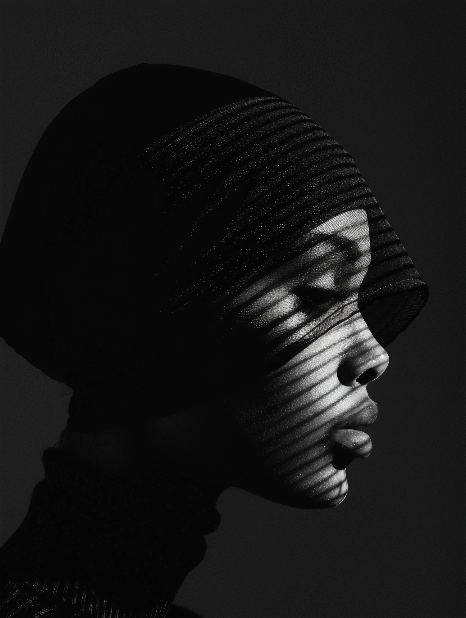 Black and white portrait with dramatic shadows on a person's face, highlighting texture and contours in a serene, contemplative pose.