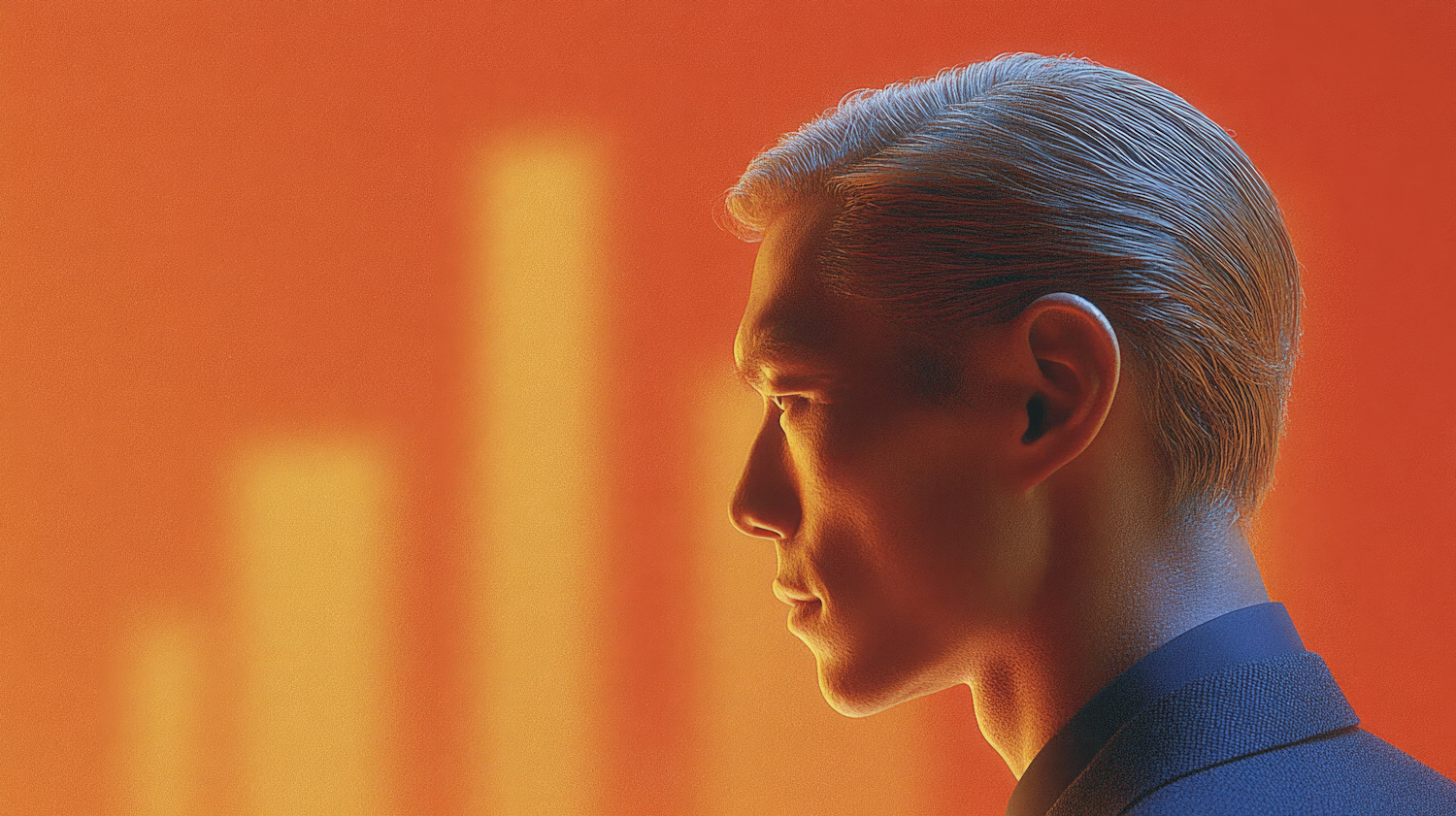 A profile of an Asian man in a suit against an orange background with abstract shapes, emphasizing light and shadow contrasts.