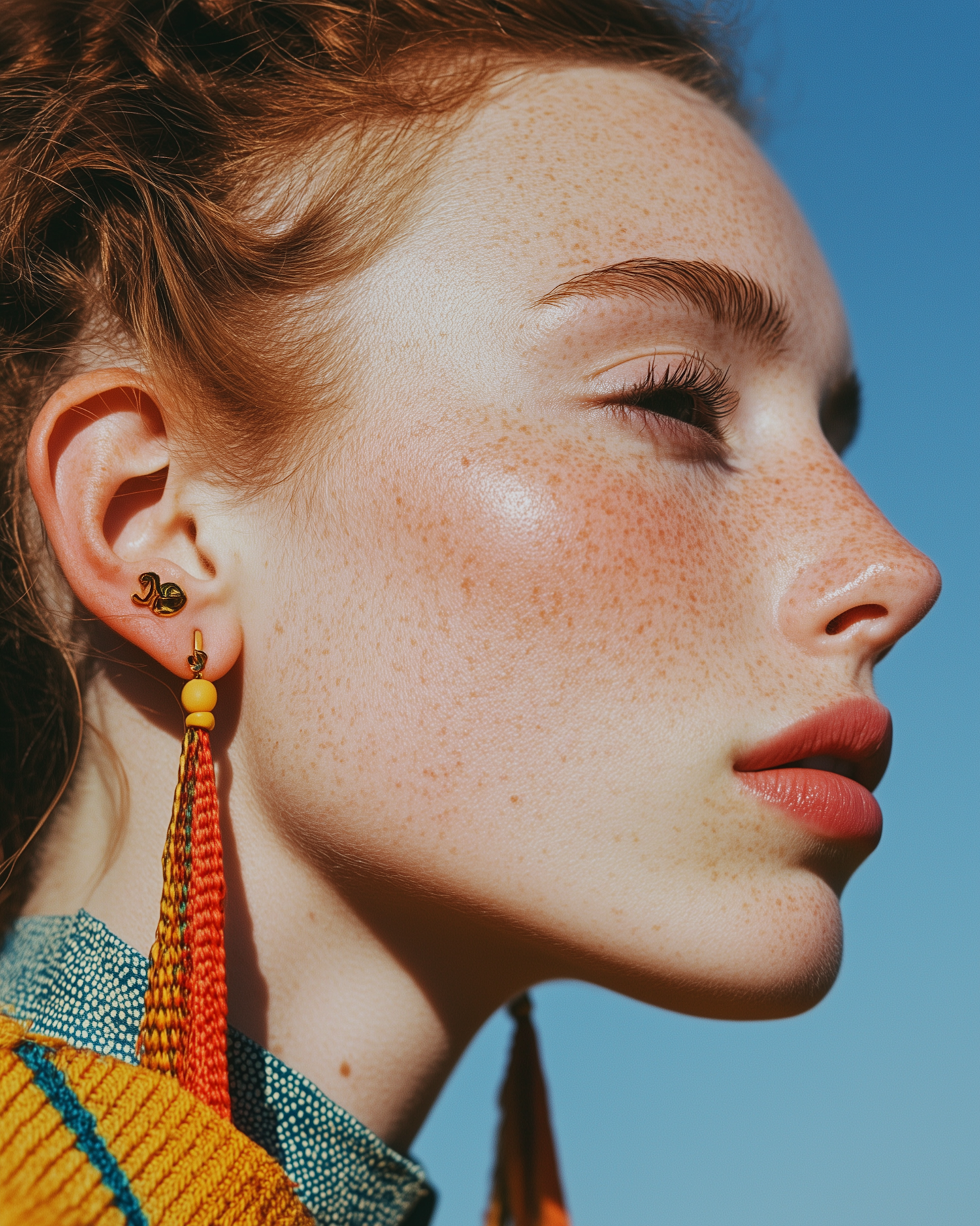 Close-up of a freckled woman with auburn hair and colorful tassel earrings against a blue sky, exuding calm and confidence.