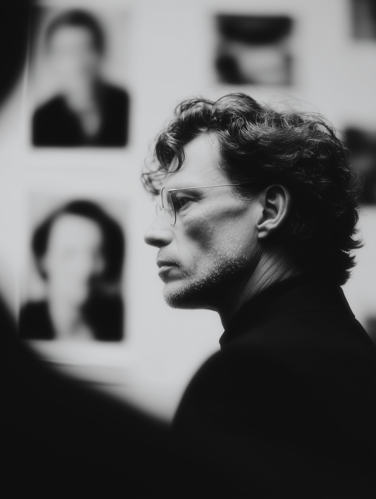 Black-and-white profile of a man with glasses and curly hair, set against a backdrop of blurred portraits.