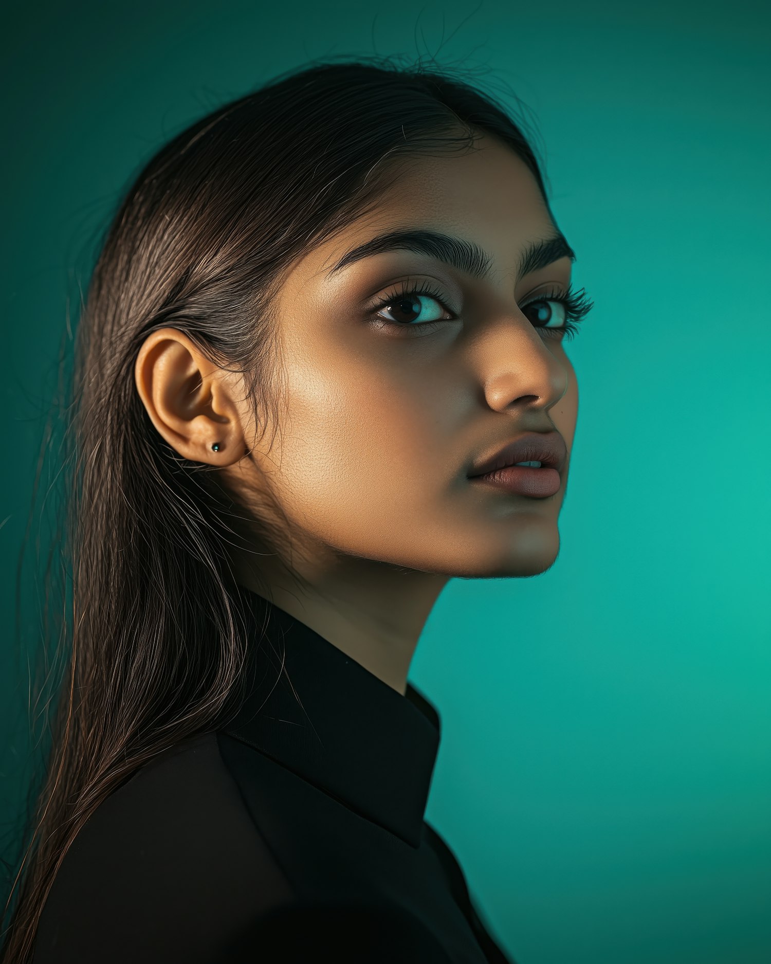 Profile of a young woman with long black hair and brown skin against a teal background, exuding calm and elegance.