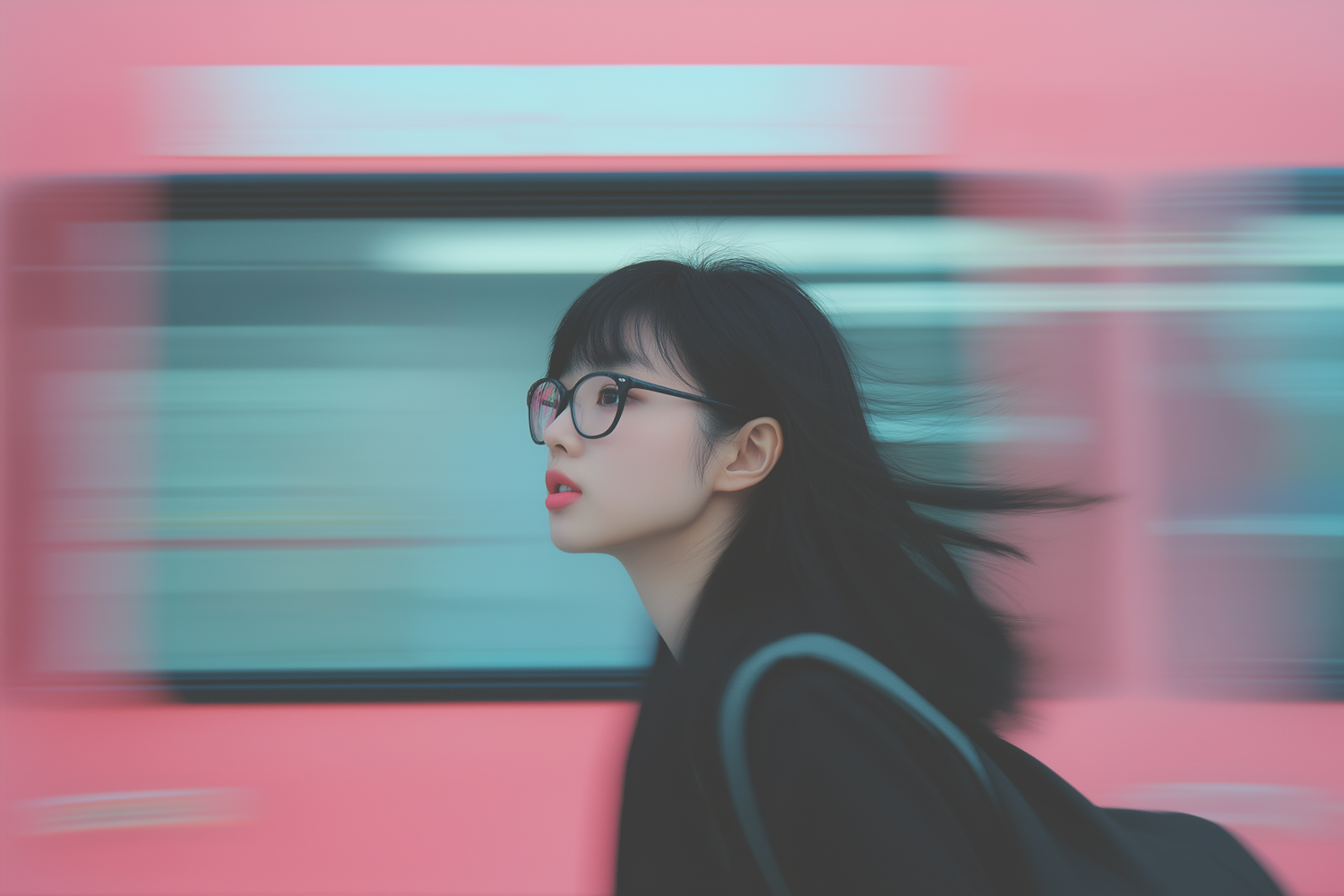 Profile of an Asian woman with glasses and red lips against a motion-blurred pink and teal background, suggesting urban movement.