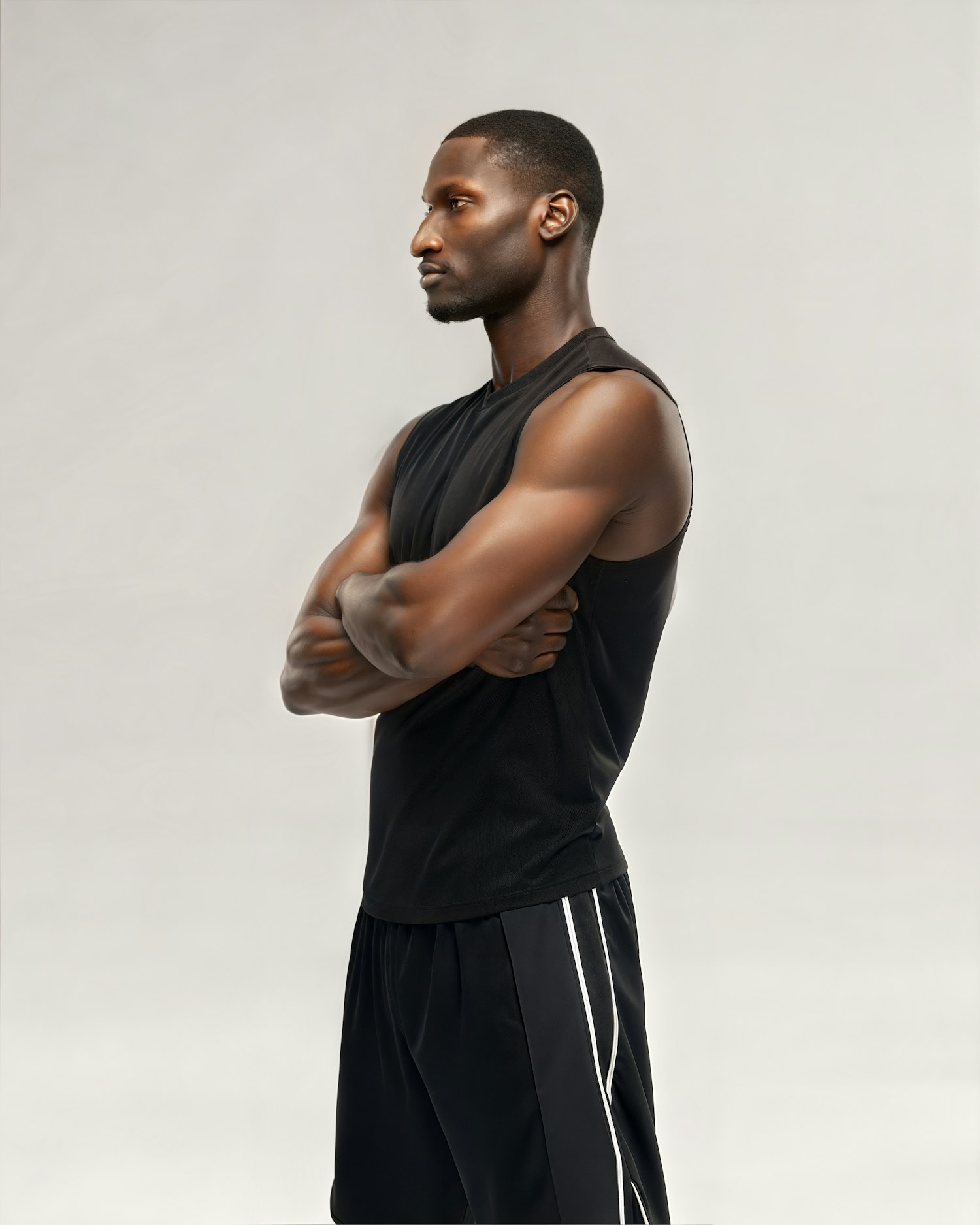 A man in a sleeveless black shirt and athletic shorts stands in profile with arms crossed, set against a neutral gray background.