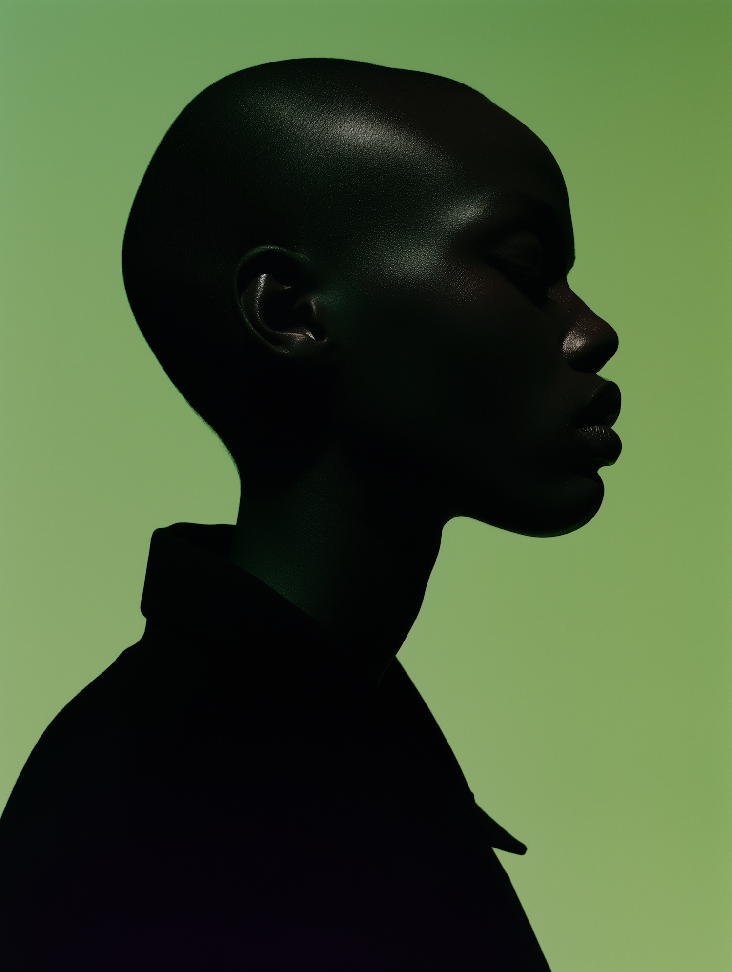 Minimalist profile of a person with dark skin against a vibrant green background, highlighting elegant contours and smooth textures.
