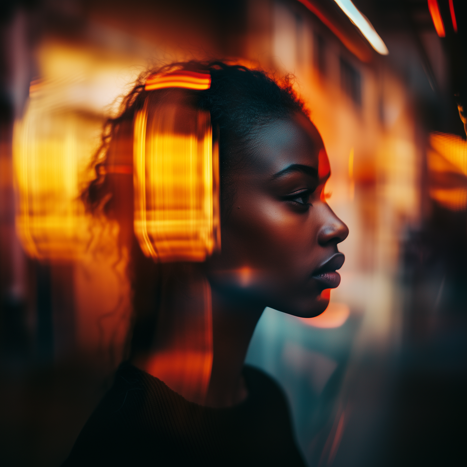 Profile of a young Black woman with vibrant orange light streaks, creating a dreamy and cinematic atmosphere.