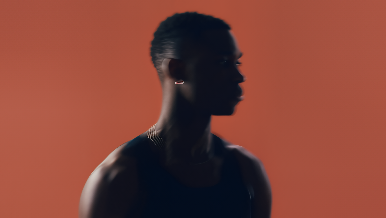A blurred profile portrait of a person with short hair and a necklace, set against a vibrant orange background.