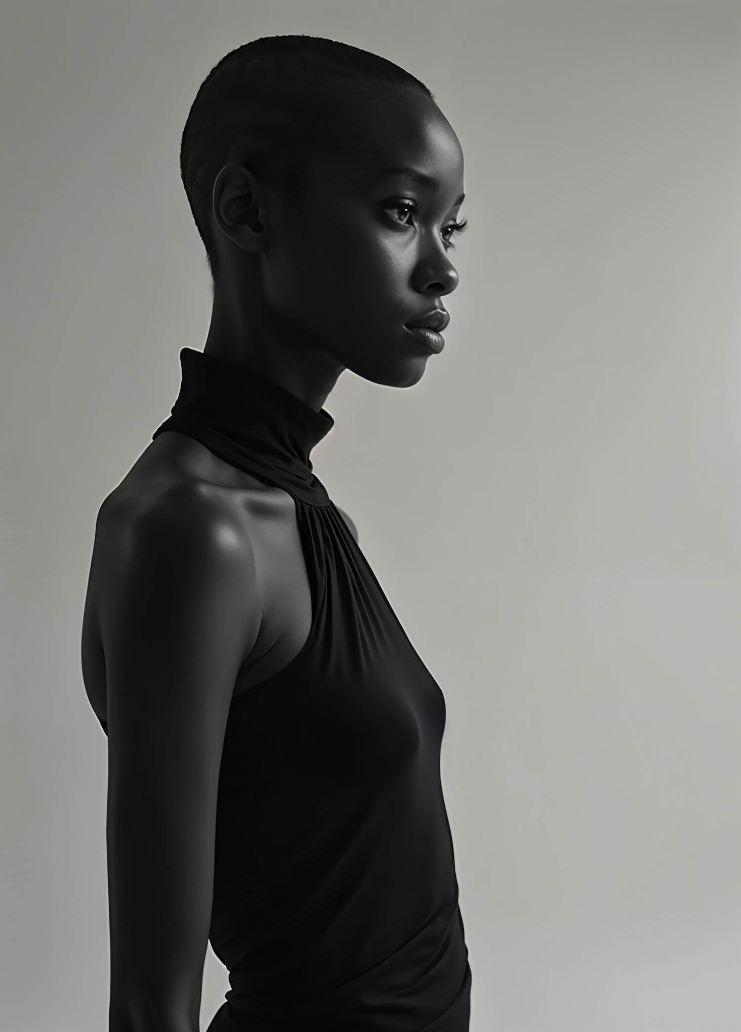 Elegant profile portrait of a woman with a shaved head in a sleek black top, set against a neutral gray background.